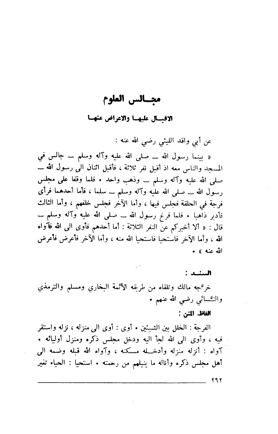 " بَيْنَمَا رَسُولُ اللَّهِ- صَلَّى اللهُ عَلَيْهِ وَآلِهِ وَسَلَّمَ- جَالِسٌ فِي المَسْجِدِ وَالنَّاسُ مَعَهُ إِذْ أَقْبَلَ نَفَرٌ ثَلاَثَةٌ، فَأَقْبَلَ اثْنَانِ إِلَى رَسُولِ اللَّهِ -صَلَّى اللهُ عَلَيْهِ وَآلِهِ وَسَلَّمَ- وَذَهَبَ وَاحِدٌ. فَلَمَّا وَقَفَا عَلَى مَجْلِسِ رَسُولِ اللَّهِ- صَلَّى اللهُ عَلَيْهِ وَآلِهِ وَسَلَّمَ- سَلَّمَا، فَأَمَّا أَحَدُهُمَا فَرَأَى فُرْجَةً فِي الْحَلْقَةِ فَجَلَسَ فِيهَا، وَأَمَّا الْآخَرُ فَجَلَسَ خَلْفَهُمْ، وَأَمَّا الثَّالِثُ فَأَدْبَرَ ذَاهِبًا. فَلَمَّا فَرَغَ رَسُولُ اللَّهِ -صَلَّى اللهُ عَلَيْهِ وَآلِهِ وَسَلَّمَ- قَالَ: «أَلَا أُخْبِرُكُمْ عَنِ النَّفَرِ الثَّلَاثَةِ: أَمَّا أَحَدُهُمْ فَأَوَى إِلَى اللَّهِ فَآوَاهُ اللَّهُ، وَأَمَّا الْآخَرُ فَاسْتَحْيَا فَاسْتَحْيَا اللَّهُ مِنْهُ، وَأَمَّا الْآخَرُ فَأَعْرَضَ فَأَعْرَضَ اللَّهُ عَنْهُ» ".