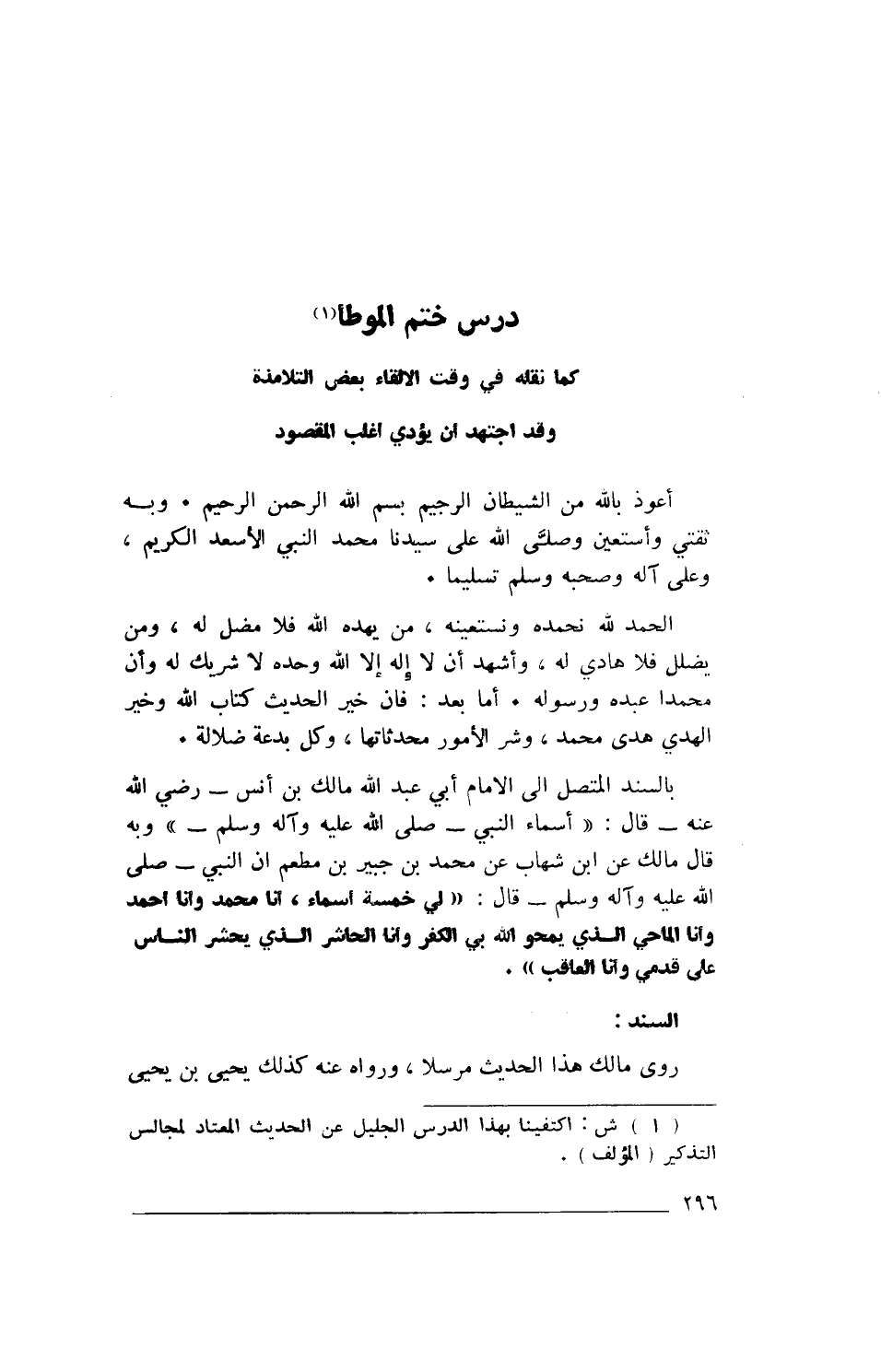 بالسند المتصل إلى الإمام أبي عبد الله مالك بن أنس- رضي الله عنه- قال: " أَسْمَاءُ النَّبِيِّ- صَلَّى اللهُ عَلَيْهِ وَآلِهِ وَسَلَّمَ- " وَبِهِ قَالَ مَالِكٌ عَنِ ابْنِ شِهَابٍ عَنْ مُحَمَّدِ بْنِ جُبَيْرِ بْنِ مُطْعِمٍ أَنَّ النَّبِيَّ- صَلَّى اللهُ عَلَيْهِ وَآلِهِ وَسَلَّمَ- قَالَ: «لِي خَمْسَةُ أَسْمَاءٍ: أَنَا مُحَمَّدٌ وَأَنَا أَحْمَدُ وَأَنَا الْمَاحِي الَّذِي يَمْحُو اللهُ بِيَ الْكُفْرَ وَأَنَا الْحَاشِرُ الَّذِي يُحْشَرُ النَّاسُ عَلَى قَدَمِي وَأَنَا الْعَاقِبُ».