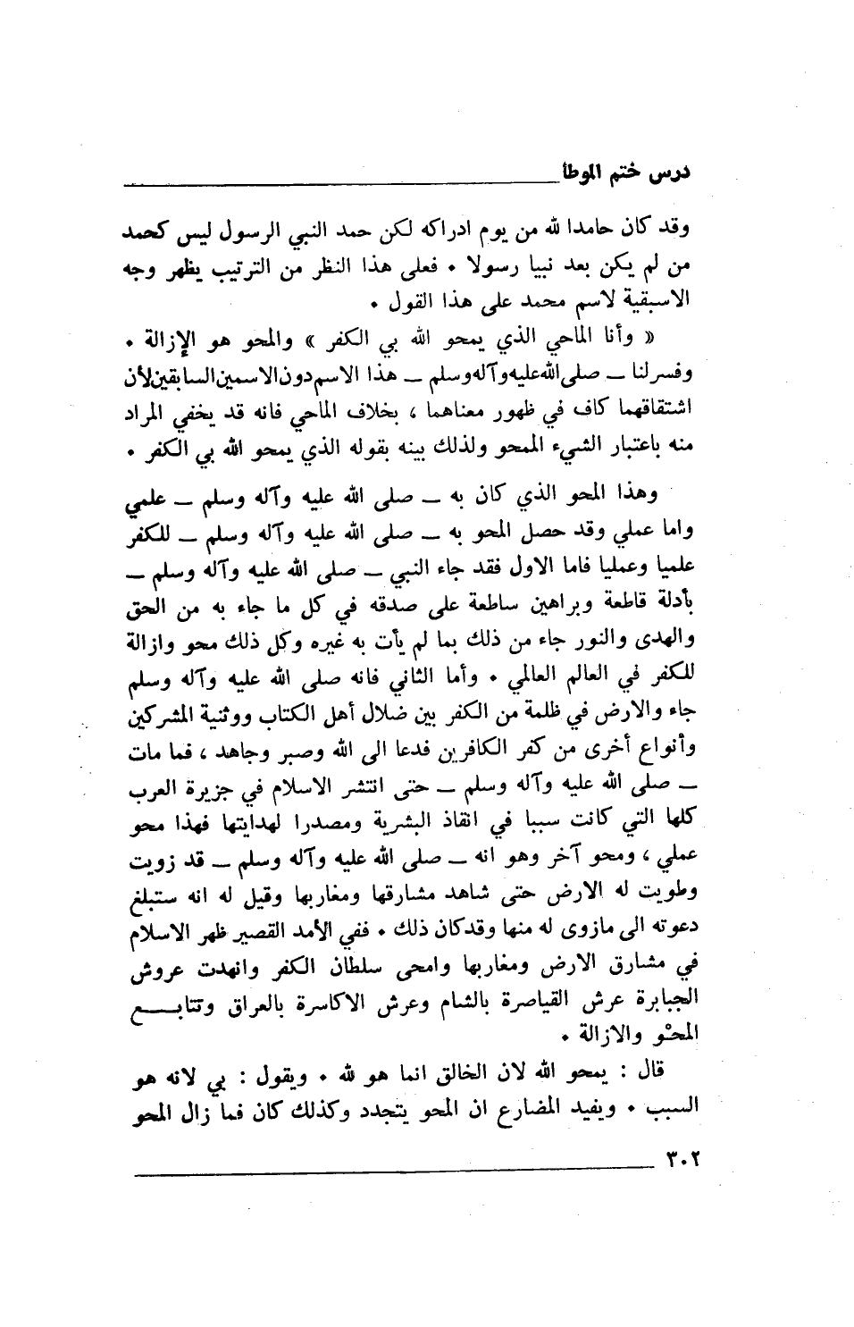 وهذا المحو الذي كان به- صلى الله عليه وآله وسلم- علمي واما عملي وقد حصل المحو به- صلى الله عليه وآله وسلم- للكفر علميا وعمليا فأما الأول فقد جاء النبي- صلى الله عليه وآله وسلم- بأدلة قاطعة وبراهين ساطعة على صدقه في كل ما جاء به من الحق والهدى والنور جاء من ذلك بما لم يأت به غيره وكل ذلك محو وإزالة للكفر في العالم العالمي. وأما الثاني فإنه صلى الله عليه وآله وسلم جاء والأرض في ظلمة من الكفر بين ضلال أهل الكتاب ووثنية المشركين وأنواع أخرى من كفر الكافرين فدعا إلى الله وصبر وجاهد، فما مات - صلى الله عليه وآله وسلم- حتى انتشر الإسلام في جزبرة العرب كلها التي كانت سببا في إنقاذ البشربة ومصدرا لهدايتها فهذا محو عملي ومحو آخر وهو أنه- صلى الله عليه وآله وسلم- قد زويت وطويت له الأرض حتى شاهد مشارقها ومغاربها وقيل له أنه ستبلغ دعوته إلى ما زوي له منها وقد كان ذلك. ففي الأمد القصير ظهر الإسلام في مشارق الأرض ومغاربها وامحى سلطان الكفر وانهدت عروش الجبابرة عرش القياصرة بالشام وعرش الأكاسرة بالعراق وتتابع المحْو والإزالة.