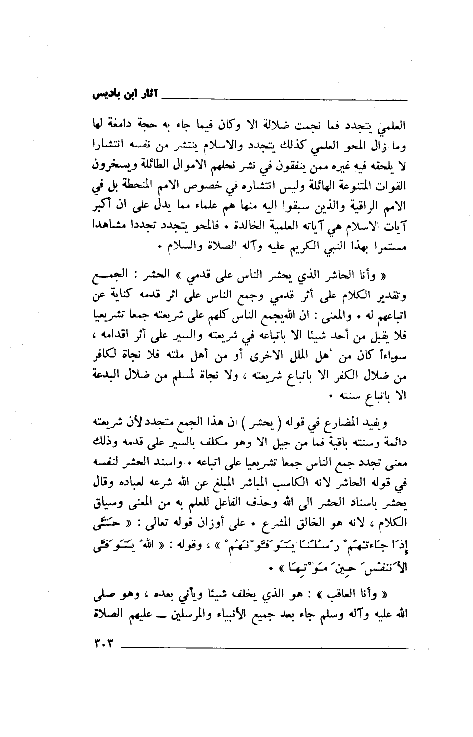 «وَأَنَا الْحَاشِرُ الَّذِي يُحْشَرُ النَّاسُ عَلَى قَدَمِي» الحشر: الجمع وتقدير الكلام على أثر قدمي وجمع الناس على أثر قدمه كناية عن اتباعهم له. والمعنى: أن الله يجمع الناس كلهم على شريعته جمعا تشريعيا فلا يقبل من أحد شيئا إلا باتباعه في شريعته والسير على أثر إقدامه، سواء أكان من أهل الملل الأخرى أو من أهل ملته فلا نجاة لكافر من ضلال الكفر إلا باتباع شريعته، ولا نجاة لمسلم من ضلال البدعة إلا باتباع سنته.