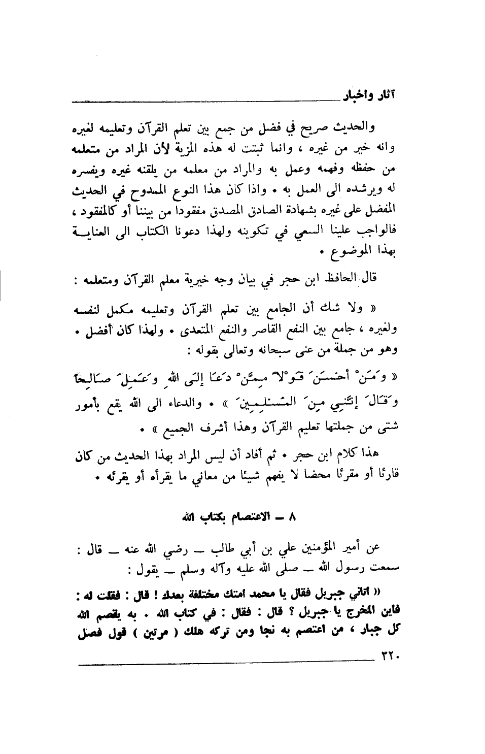 عن أمير المؤمنين علي بن أبي طالب- رضي الله عنه- قال: سمعت رسول الله- صلى الله عليه وآله وسلم- يقول: «أتاني جبريل فقال يا محمد أمتك مختلفة بعدك! قال: فقلت له: فأين المخرج يا جبريل؟ قال: فقال: في كتاب الله. به يقصم الله كل جبار، من اعتصم به نجا ومن تركه هلك (مرتن) قول فصل