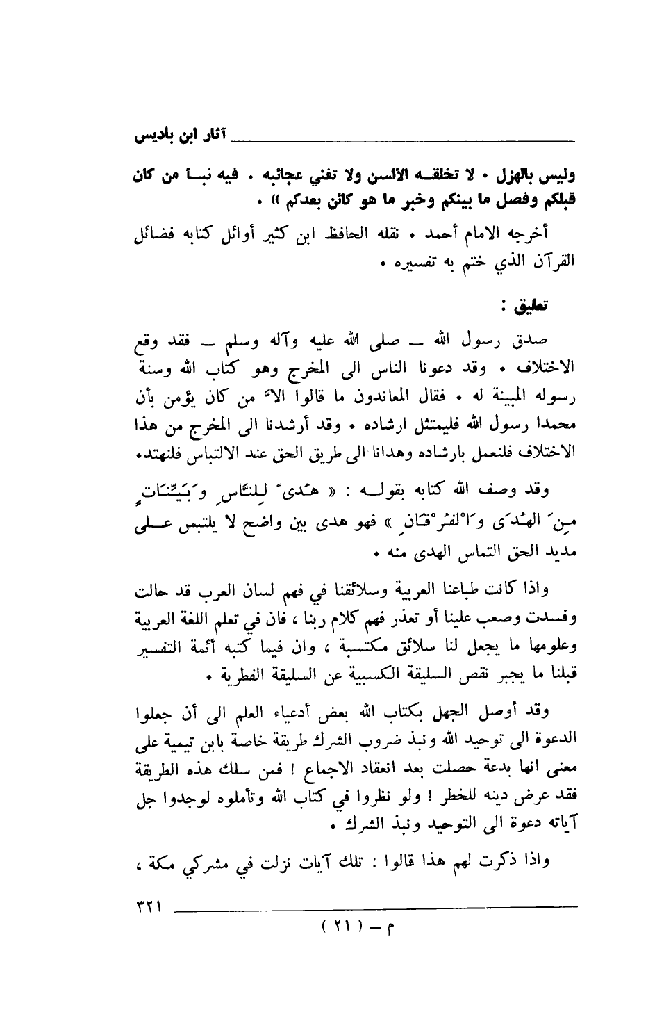 وليس بالهزل. لا تخلقه الألسن ولا تفنى عجائبه. فيه نبأ من كان قبلكم وفصل ما بينكم وخبر ما هو كائن بعدكم».