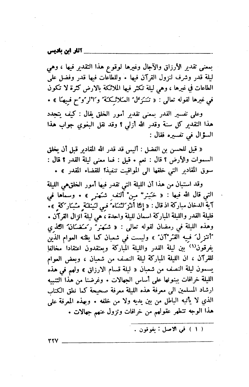 " قيل للحسن بن الفضل: أليس قد قدر الله المقادير قبل أن يخلق السموات والأرض؟ قال: نعم. قيل: فما معنى ليلة القدر؟ قال: سوق المقادير التي خلقها إلى المواقيت تنفيذاً للقضاء المقدر". وقد استبان من هذا أن الليلة التي تقدر فيها أمور الخلق هي الليلة التي قال الله فيها: {خَيْرٌ مِنْ أَلْفِ شَهْرٍ}. وسماها في آية الدخان مباركة إذ قال: {إِنَّا أَنْزَلْنَاهُ فِي لَيْلَةٍ مُبَارَكَةٍ}. فليلة القدر والليلة المباركة إسمان لليلة واحدة، هي ليلة إنزال القرآن. وهذه الليلة في رمضان لقوله تعالى: {شَهْرُ رَمَضَانَ الَّذِي أُنْزِلَ فِيهِ الْقُرْآنُ} وليست في شعبان كما يظنه العوام الذين يفرقون (1) بين ليلة القدر والليلة المباركة ويعتقدون اعتقادا مخالفا للقرآن، أن الليلة المباركة ليلة النصف من شعبان، وبعض العوام يسمون ليلة النصف من شعبان ((ليلة قسام الأرزاق)) ولهم في هذه الليلة خرافات يبنونها على أساس الجهالات. وغرضنا من هذا التنبيه إرشاد المسلمين إلى معرفة هذه الليلة معرفة صحيحة كما نطق الكتاب الذي لا يأتيه الباطل من بين يديه ولا من خلفه. وبهذه المعرفة على هذا الوجه تتطهر عقولهم من خرافات وتزول عنهم جهالات.