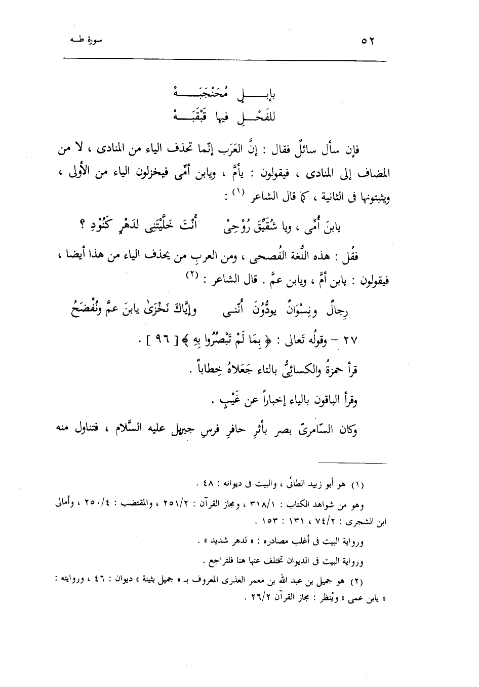 فإن سأل سائل فقال: إنّ العرب إنّما تحذف الياء من المنادى، لا من المضاف إلى المنادى، فيقولون: يؤمّ، ويا ابن أمّى فيخزلون الياء من الأولى، ويثبتونها فى الثانية، كما قال الشاعر (¬١):