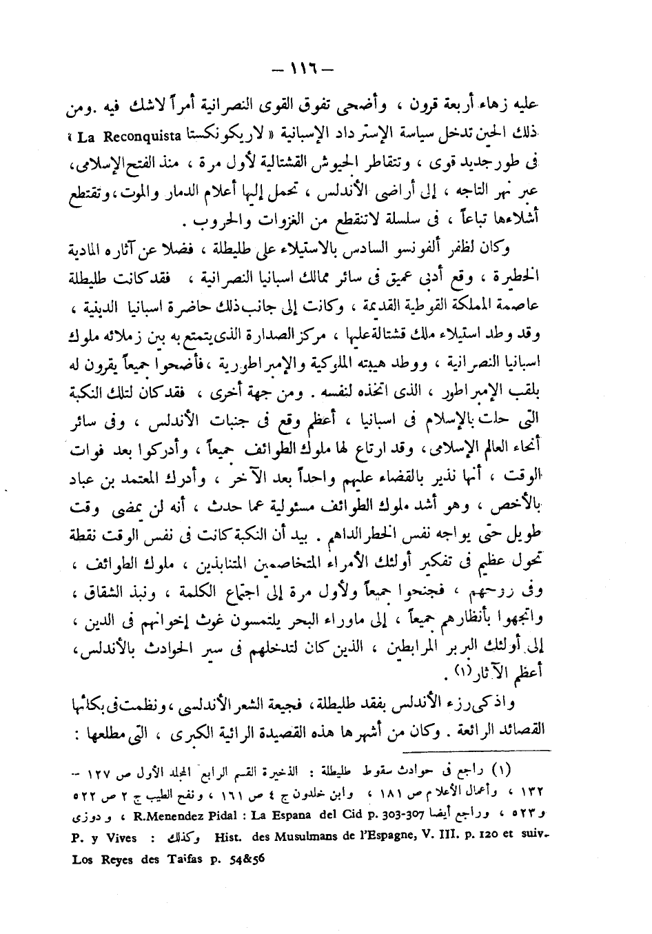 (¬1) راجع في حوادث سقوط طليطلة: الذخيرة القسم الرابع المجلد الأول ص 127 - 132، وأعمال الأعلام ص 181، وابن خلدون ج 4 ص 161، ونفح الطيب ج 2 ص 522 و523، وراجع أيضاً R.Menendez Pidal: La Espana del Cid p. 303-307، ودوزي Hist. des Musulmans de l'Espagne, V.III.p.120 et suiv. وكذلك: P.y Vives Los Reyes des Taifas p. 54 & 56