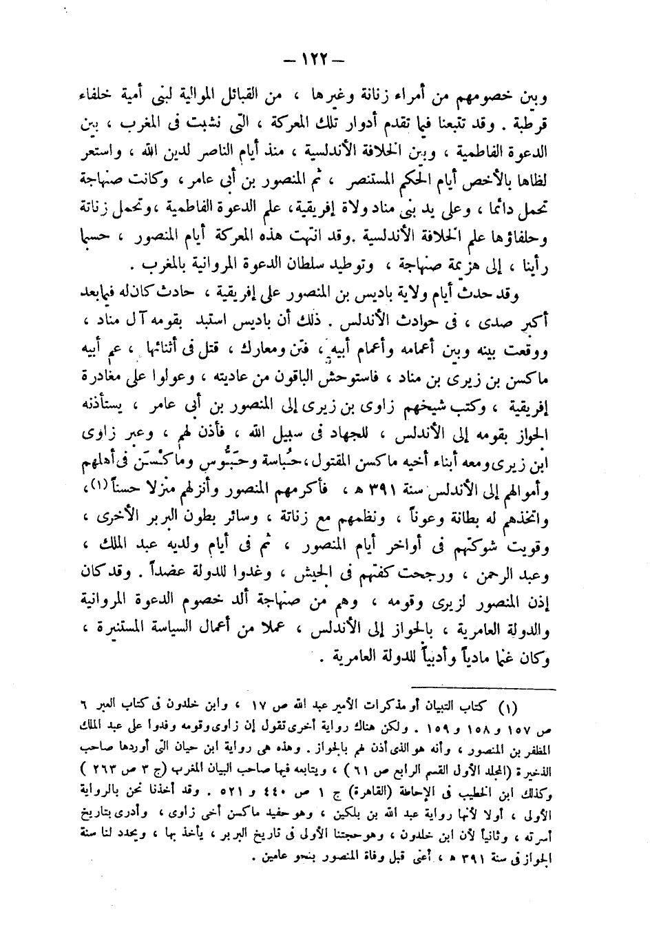(¬1) كتاب التبيان أو مذكرات الأمير عبد الله ص 17، وابن خلدون في كتاب العبر ج 6 ص 157 و 158 و 159. ولكن هناك رواية أخرى تقول إن زاوي وقومه وفدوا على عبد الملك المظفر بن المنصور، وأنه هو الذي أذن لهم بالجواز. وهذه هي رواية ابن حيان التي أوردها صاحب الذخيرة (المجلد الأول القسم الرابع ص 61)، ويتابعه فيها صاحب البيان المغرب (ج 3 ص 263) وكذلك ابن الخطيب في الإحاطة (القاهرة) ج 1 ص 440 و 521. وقد أخذنا نحن بالرواية الأولى، أولا لأنها رواية عبد الله بن بلكين، وهو حفيد ماكسن أخى زاوي، وأدرى بتاريخ أسرته، وثانياً لأن ابن خلدون، وهو حجتنا الأولى في تاريخ البربر، يأخذ بها، ويحدد لنا سنة الجواز في سنة 391 هـ، أعني قبل وفاة المنصور بنحو عامين.