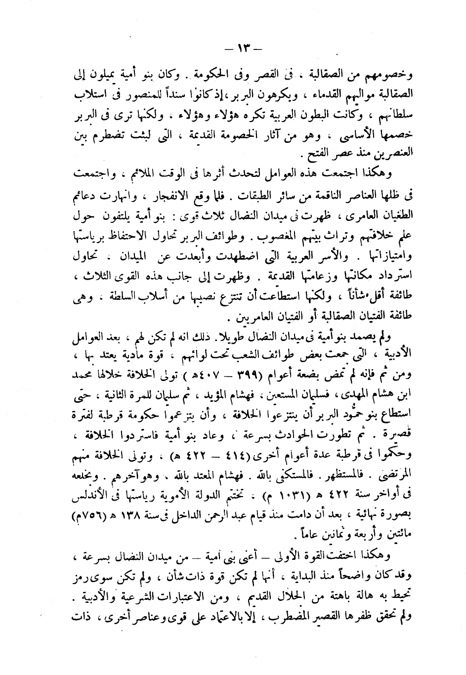 وخصومهم من الصقالبة، في القصر وفي الحكومة. وكان بنو أمية يميلون إلى الصقالبة مواليهم القدماء، ويكرهون البربر، إذ كانوا سنداً للمنصور في استلاب سلطانهم، وكانت البطون العربية تكره هؤلاء وهؤلاء، ولكنها ترى في البربر خصمها الأساسي، وهو من آثار الخصومة القديمة، التي لبثت تضطرم بين العنصرين منذ عصر الفتح.