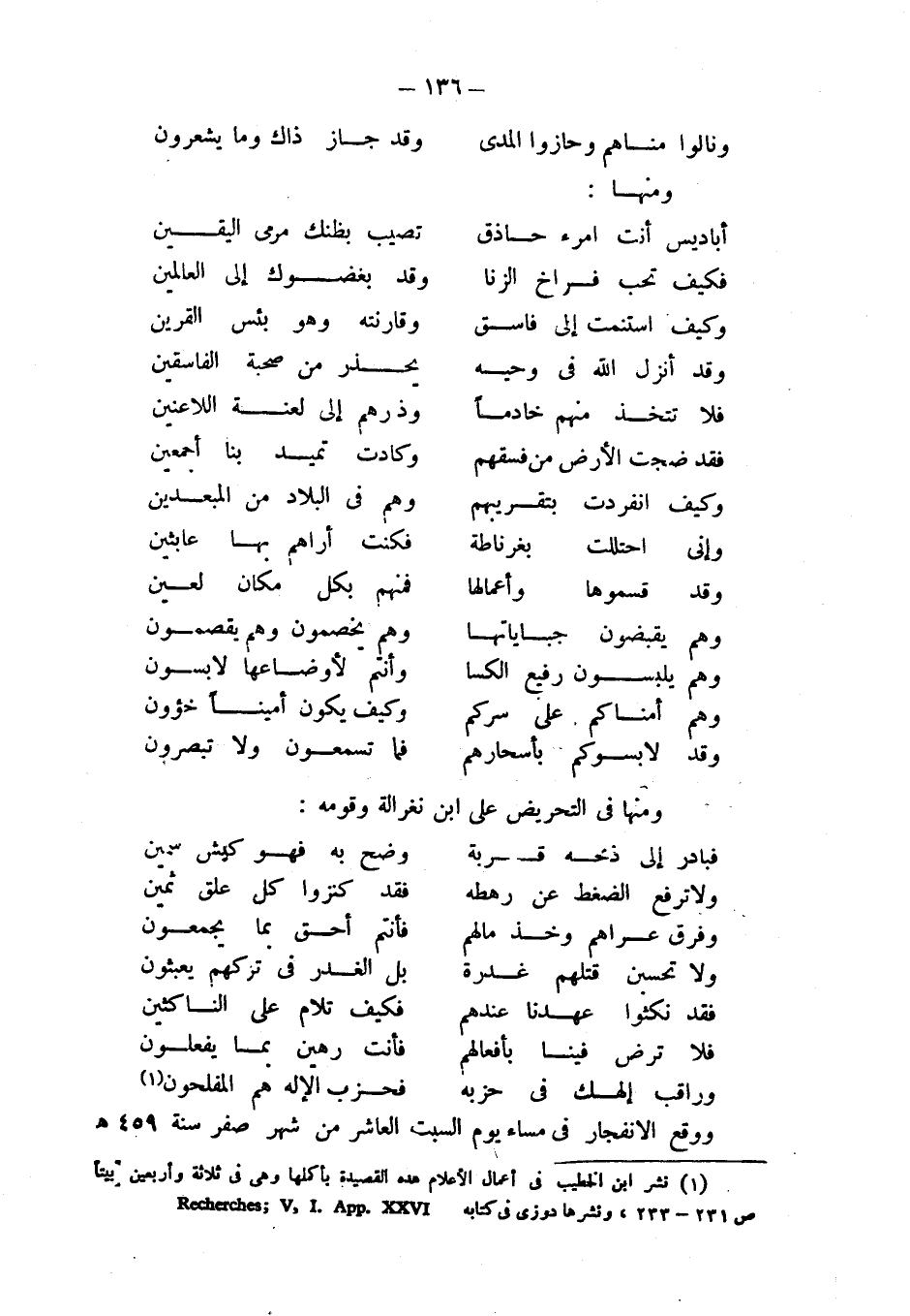 (¬1) نشر ابن الخطيب في أعمال الأعلام هذه القصيدة بأكملها وهي في ثلاثة وأربعين بيتاً ص 231 - 233، ونشرها دوزي في كتابه Recherches; V,I.App.XXVI