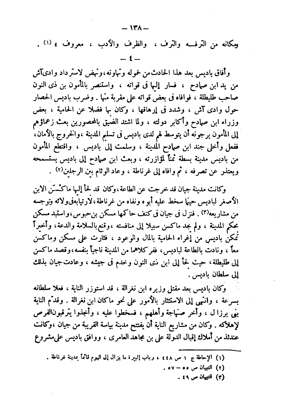 وكانت مدينة جيان قد خرجت عن الطاعة، وكان قد لجأ إليها ماكْسَن الابن الأصغر لباديس حينما سخط عليه أبوه ونفاه من غرناطة، لارتيابه في ولائه وتوجسه من مشاريعه (¬3). فنزل في جيان في كنف حاكمها مسكن بن حبوس، واستبد مسكن بحكم المدينة، ولم يجد ماكسن سبيلا إلى منافسته، وقنع بالسلامة والدعة، وأخيراً تمكن باديس من إغراء الحامية بالمال والوعود، فثارت على مسكن وماكسن معاً، ونادت بالطاعة لباديس، ففر كلاهما من المدينة ناجياً بنفسه، وقصد ماكسن إلى طليطلة، حيث لجأ إلى ابن ذى النون وخدم في جيشه، وعادت جيان بذلك إلى سلطان باديس.