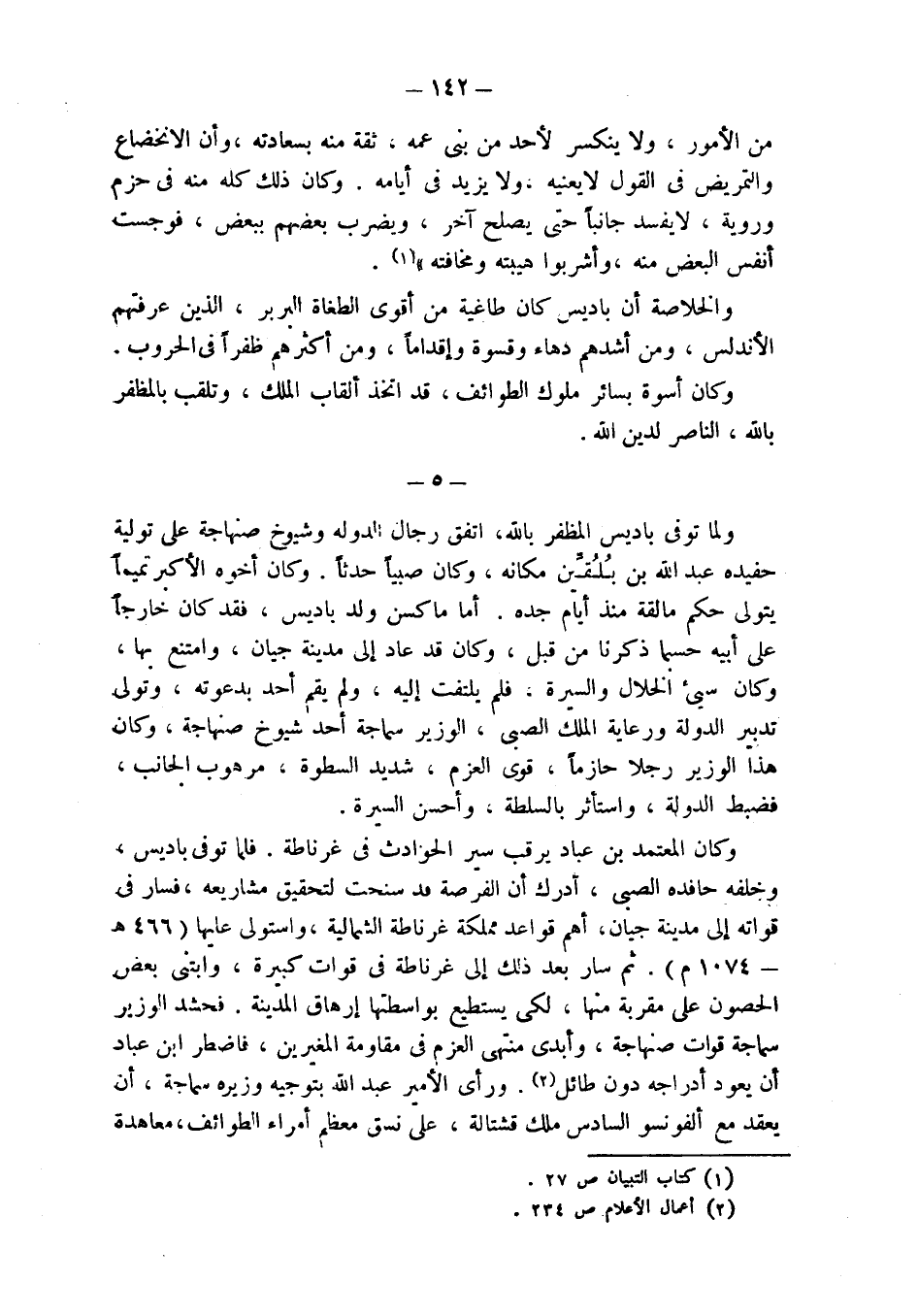 وكان المعتمد بن عباد يرقب سير الحوادث في غرناطة. فلما توفي باديس، وخلفه حفيده الصبي، أدرك أن الفرصة قد سنحت لتحقيق مشاريعه، فسار في قواته إلى مدينة جيان، أهم قواعد مملكة غرناطة الشمالية، واستولى عليها (466 هـ - 1074 م). ثم سار بعد ذلك إلى غرناطة في قوات كبيرة، وابتنى بعض الحصون على مقربة منها، لكي يستطيع بواسطتها إرهاق المدينة. فحشد الوزير سماجة قوات صنهاجة، وأبدى منتهى العزم في مقاومة المغيرين، فاضطر ابن عباد أن يعود أدراجه دون طائل (¬2). ورأى الأمير عبد الله بتوجيه وزيره سماجة، أن يعقد مع ألفونسو السادس ملك قشتالة، على نسق معظم أمراء الطوائف، معاهدة