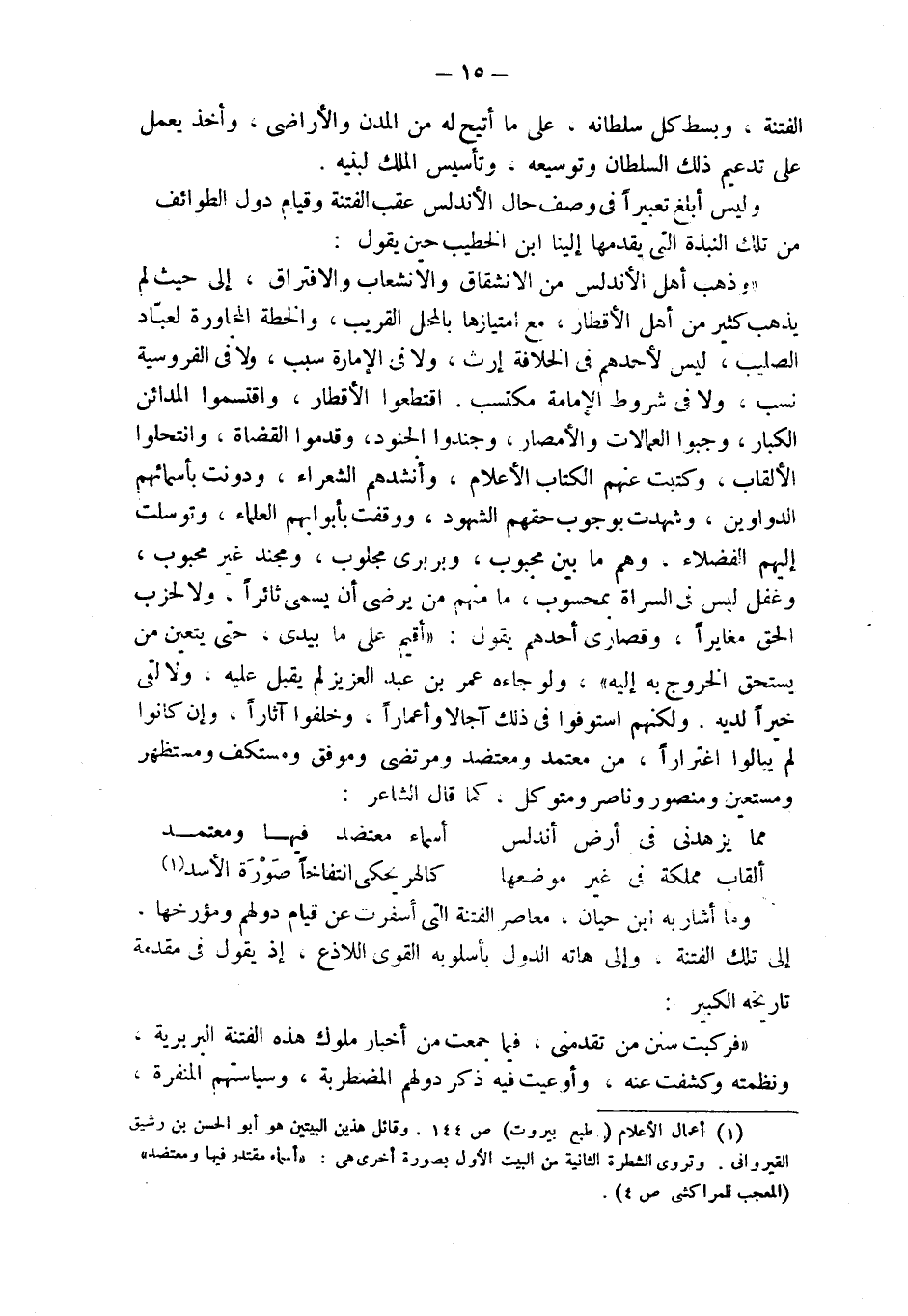 (¬1) أعمال الأعلام (طبع بيروت) ص 144. وقائل هذين البيتين هو أبو الحسن بن رشيق القيرواني. وتروي الشطرة الثانية من البيت الأول بصورة أخرى هي: " أسماء مقتدر فيها ومعتضد " (المعجب للمراكشي ص 4).