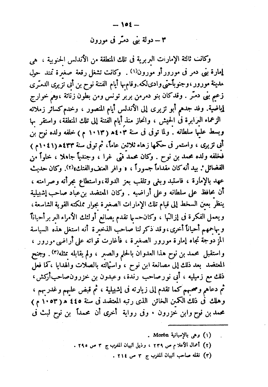 وكانت ثالثة الإمارات البربرية في تلك المنطقة من الأندلس الجنوبية، هي إمارة بني دمر في مورور أو مورون (¬1). وكانت تشغل رقعة صغيرة تمتد حول مدينة مورور، وجنوباً حتى وادي لكه. وقام بها أيام الفتنة نوح بن أبي تزيري الدمّري زعيم بني دمّر. وقد كان بنو دمر من بربر تونس ومن بطون زناتة، وهم خوارج إباضية. وفد جدهم أبو تزيري إلى الأندلس أيام المنصور، وخدم كسائر زملائه الزعماء البرابرة في الجيش، وانحاز منذ أيام الفتنة إلى تلك المنطقة، واستقر بها وبسط عليها سلطانه. ولما توفي في سنة 403 هـ (1013 م) خلفه ولده نوح بن أبي تزيري، واستمر في حكمها زهاء ثلاثين عاماً، ثم توفي سنة 433 هـ (1041 م) فخلفه ولده محمد بن نوح. وكان محمد فتى غراً، وجندياً جاهلا، خلواً من الفضائل. بيد أنه كان مقداماً جسوراً، " وافر العنف والفتك " (¬2). وكان حديث عهد بالإمارة، فاستبد وبغى وتلقب بعز الدولة، واستطاع بجرأته وصرامته، أن يحافظ على سلطانه وعلى أراضيه. وكان المعتضد بن عباد صاحب إشبيلية ينظر بعين السخط إلى قيام تلك الإمارات الصغيرة بجوار مملكته القوية الشاسعة، ويعمل الفكرة في إزالتها، وكان حسبما تقدم يصانع أولئك الأمراء البربر أحياناً ويهاجمهم أحياناً أخرى، وقد ذكر لنا صاحب الذخيرة أنه استغل هذه السياسة المزدوجة تجاه إمارة مورور الصغيرة، فأغارت قواته على أراضي مورور، واستقبل محمد بن نوح هذا العدوان بالحلم والصبر، ولم يقابله بمثله (¬3). وجنح المعتضد بعد ذلك إلى مصانعة ابن نوح، واستمالته بالصلات والهدايا، كما فعل ذلك مع زميليه، أبى نور صاحب رندة، وعبدون بن خزرون صاحب أركش، ثم دعاهم وصحبهم كما تقدم إلى زيارته في إشبيلية، ثم قبض عليهم وغدر بهم، وهلك في ذلك الكمين الخائن الذي رتبه المعتضد في سنة 445 هـ (1053 م) محمد بن نوح وابن خزرون. وفي رواية أخرى أن محمداً بن نوح لبث في