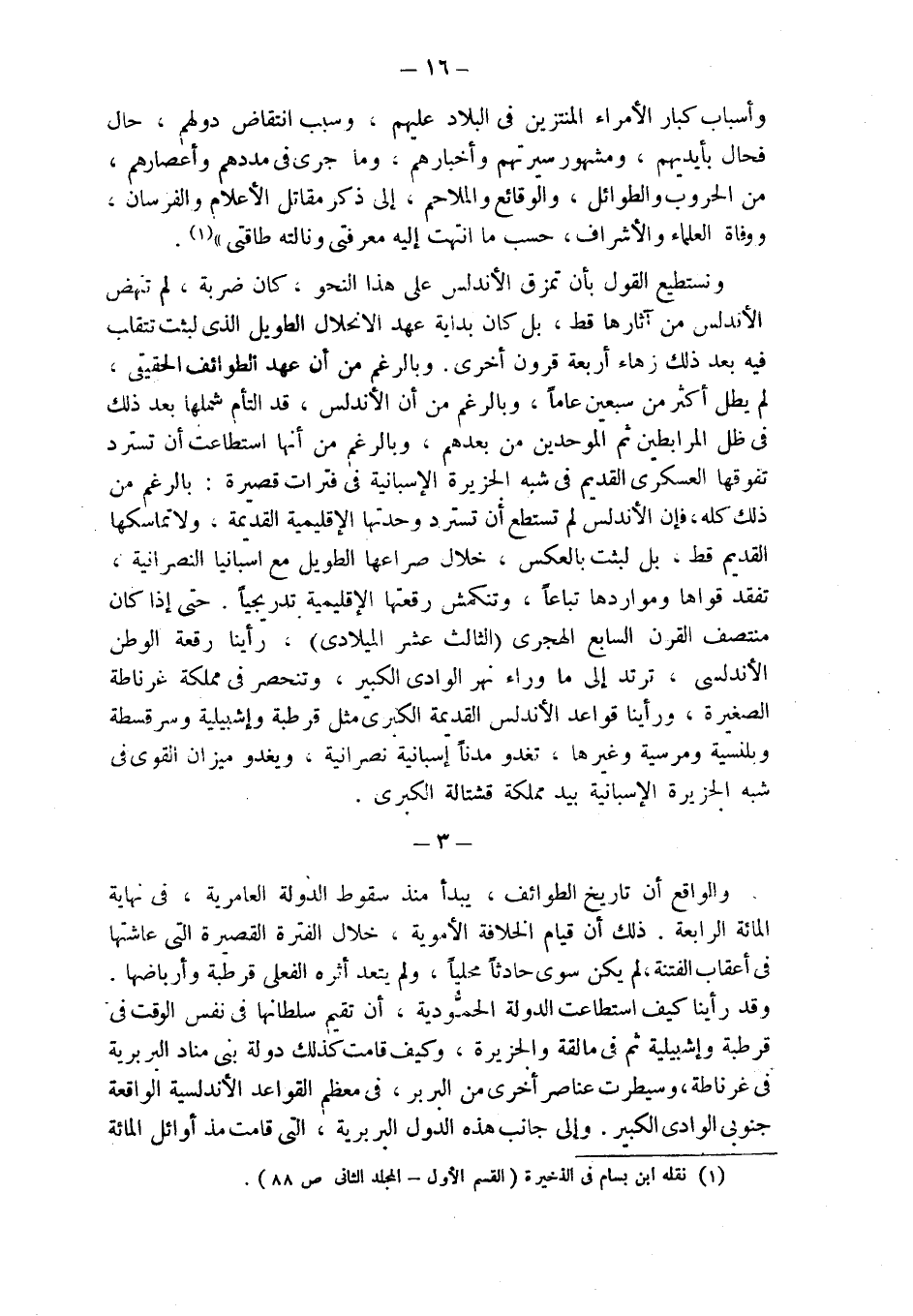 والواقع أن تاريخ الطوائف، يبدأ منذ سقوط الدولة العامرية، في نهاية المائة الرابعة. ذلك أن قيام الخلافة الأموية، خلال الفترة القصيرة التي عاشتها في أعقاب الفتنة، لم يكن سوى حادثاً محلياً، ولم يتعد أثره الفعلي قرطبة وأرباضها.