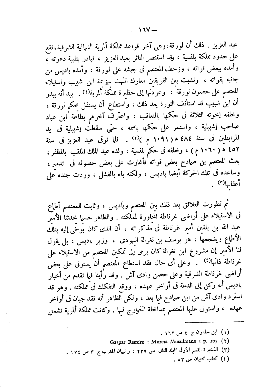 ثم تطورت العلائق بعد ذلك بين المعتصم وباديس، وثابت للمعتصم أطماع في الاستيلاء على أراضي غرناطة المجاورة لمملكته. والظاهر حسبما يحدثنا الأمير عبد الله بن بلقين أمير غرناطة في مذكراته، أن الذي كان يوحي إليه بتلك الأطماع ويشجعها، هو يوسف بن نغرالة اليهودي، وزير باديس، بل يقول لنا الأمير إن مشروع ابن نغرالة كان يرمي إلى تمكين المعتصم من الاستيلاء على غرناطة ذاتها (¬4). وعلى أي حال فقد استطاع المعتصم أن يستولي على بعض أراضي غرناطة الشرقية وعلى حصن وادي آش. وقد رأينا فيما تقدم من أخبار باديس أنه ركن إلى الدعة في أواخر عهده، ووقع التفكك في مملكته. وهو قد استرد وادي آش من ابن صمادح فيما بعد، ولكن الظاهر أنه فقد جيان في أواخر عهده، واستولى عليها المعتصم بمداخلة الخوارج فيها. وكانت مملكة ألمرية تشمل