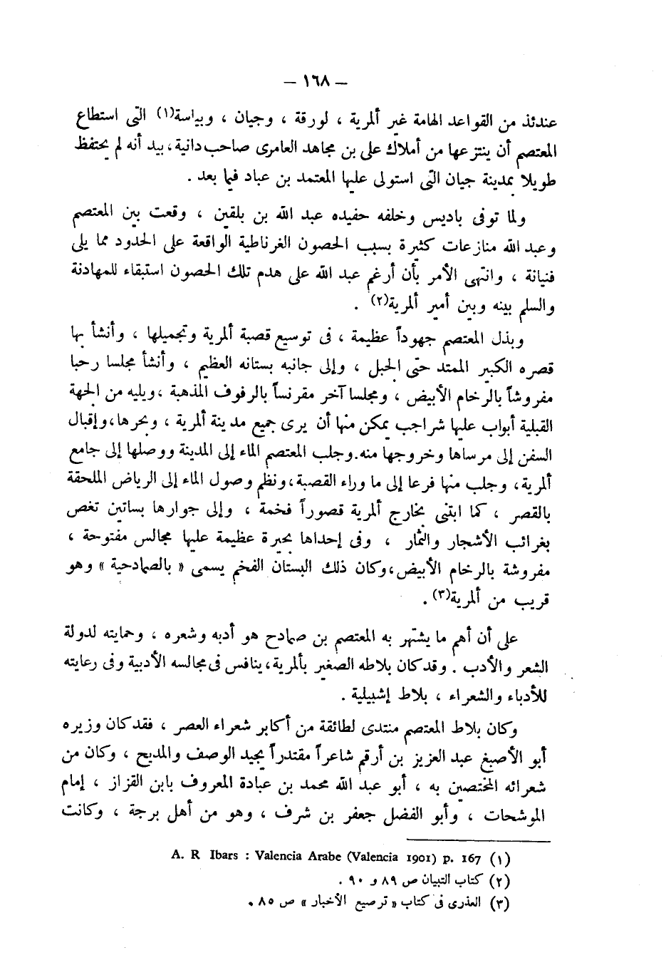 عندئذ من القواعد الهامة غير ألمرية، لورقة، وجيان، وبياسة (¬1) التي استطاع المعتصم أن ينتزعها من أملاك علي بن مجاهد العامري صاحب دانية، بيد أنه لم يحتفظ طويلا بمدينة جيان التي استولى عليها المعتمد بن عباد فيما بعد.