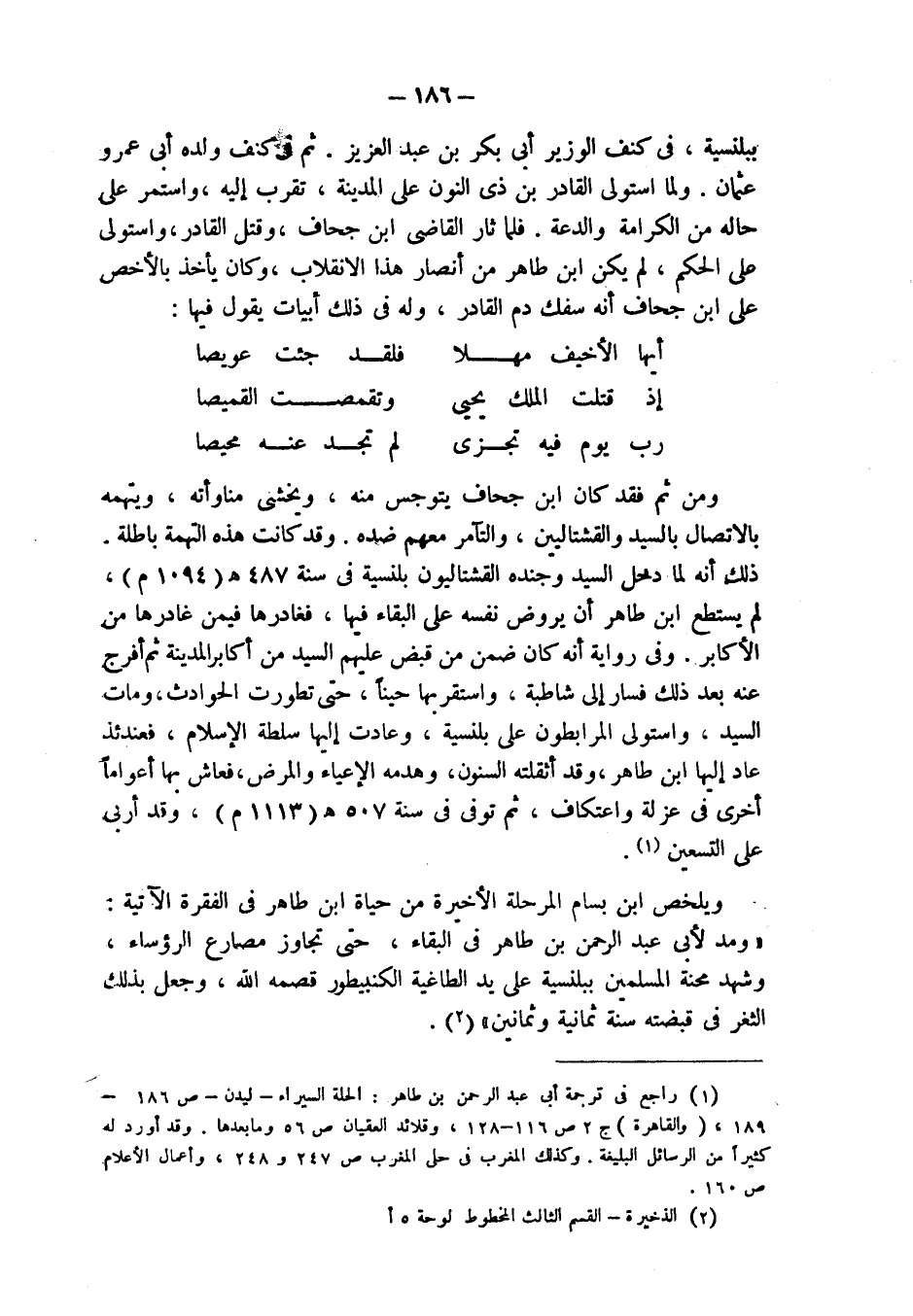 (¬1) راجع في ترجمة أبي عبد الرحمن بن طاهر: الحلة السيراء - ليدن - ص 186 - 189، و (القاهرة) ج 2 ص 116 - 128، وقلائد العقيان ص 56 وما بعدها. وقد أورد له كثيراً من الرسائل البليغة. وكذلك المغرب في حلى المغرب ص 247 و 248، وأعمال الأعلام ص 160.
