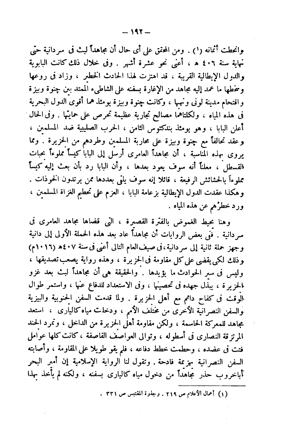 وانحطت أثمانه (¬1). ومن المحقق على أي حال أن مجاهداً لبث في سردانية حتى نهاية سنة 406 هـ، أعني نحو عشرة أشهر. وفي خلال ذلك كانت البابوية والدول الإيطالية القريبة، قد اهتزت لهذا الحادث الخطير، وزاد في روعها وسخطها ما عمد إليه مجاهد من الإغارة بسفنه على الشاطىء الممتد بين جنوة وبيزة واقتحام مدينة لوني ونهبها، وكانت جنوة وبيزة يومئذ هما أقوى الدول البحرية في هذه المياه, ولكلتاهما مصالح تجارية عظيمة تحرص على حمايتها. وفي الحال أعلن البابا، وهو يومئذ بندكتوس الثامن، الحرب الصليبية ضد المسلمين، وعقد تحالفاً مع جنوة وبيزة على محاربة المسلمين وطردهم من الجزيرة. ومما يروى بهذه المناسبة، أن مجاهداً العامري أرسل إلى البابا كيساً مملوءاً بحبات القسطل، معلناً أنه سوف يعود بعدها، وأن البابا رد بأن بعث إليه كيساً مملوءاً بالحشائش الرفيعة، قائلا إنه سوف يلقى بعددها ممن يرتدون الخوذات.