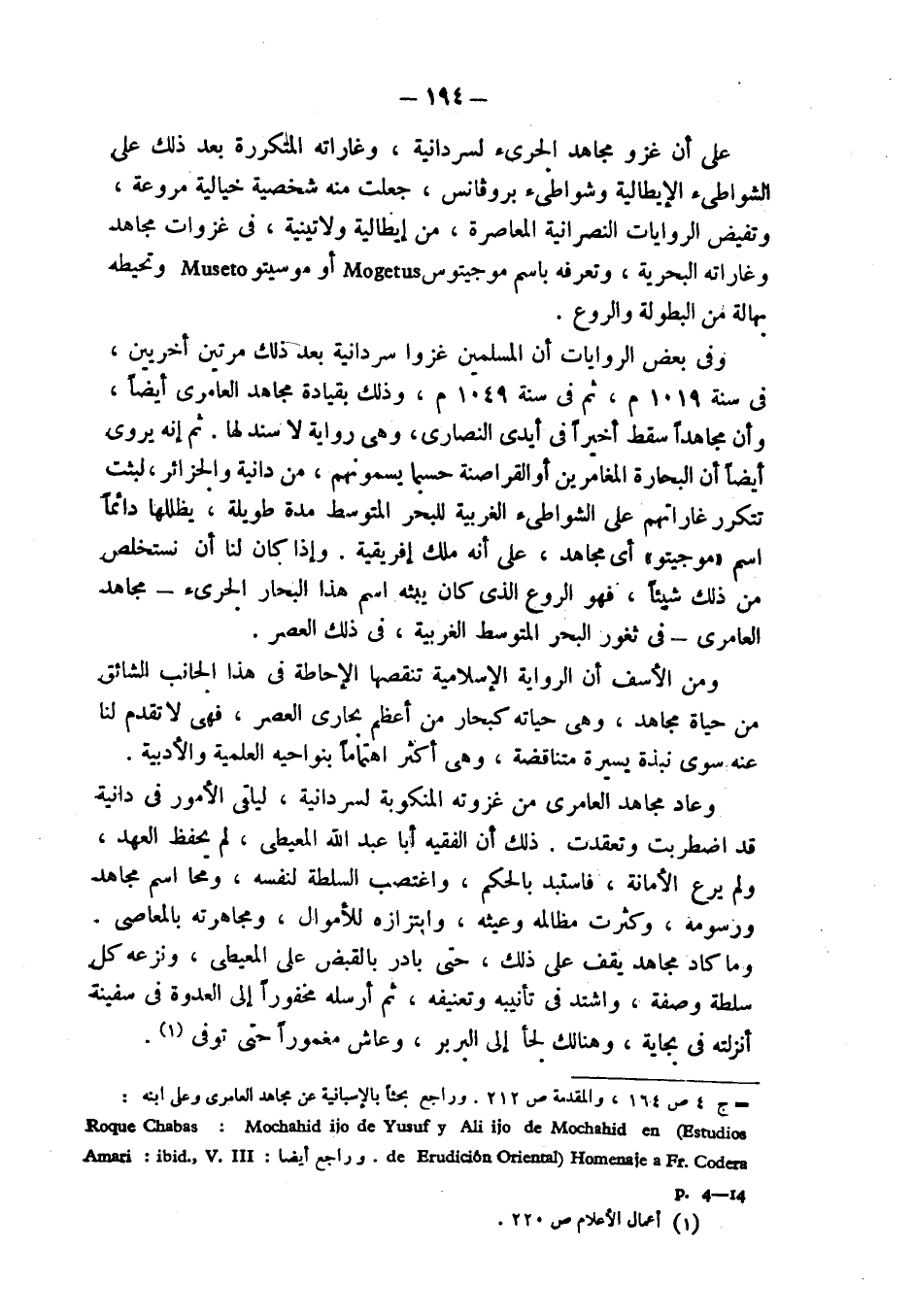 = ج 4 ص 164، والمقدمة ص 212. وراجع بحثاً بالإسبانية عن مجاهد العامري وعلي ابنه: Roque Chabas: Mochahid ijo de Yusuf y Ali ijo de Mochahid en (Estudios de Erudicion Oriental) Homenaje a Fr.Codera. وراجع أيضاً: Amari: ibid ; V.III.p. 4-14