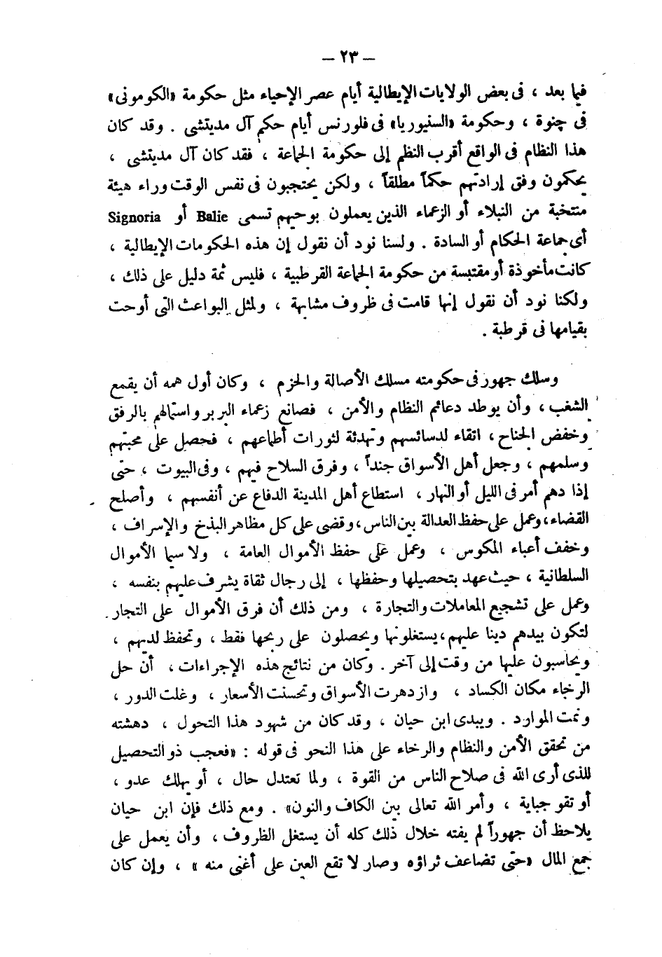 فيما بعد، في بعض الولايات الإيطالية أيام عصر الإحياء مثل حكومة "الكوموني" في جنوة، وحكومة "السنيوريا" في فلورنس أيام حكم آل مديتشى. وقد كان هذا النظام في الواقع أقرب النظم إلى حكومة الجماعة، فقد كان آل مديتشي، يحكمون وفق إرادتهم حكماً مطلقاً، ولكن يحتجبون في نفس الوقت وراء هيئة منتخبة من النبلاء أو الزعماء الذين يعملون بوحيهم تسمى Balie أو Signoria أي جماعة الحكام أو السادة. ولسنا نود أن نقول إن هذه الحكومات الإيطالية، كانت مأخوذة أو مقتبسة من حكومة الجماعة القرطبية، فليس ثمة دليل على ذلك، ولكنا نود أن نقول إنها قامت في طروف مشابهة، ولمثل البواعث التي أوحت بقيامها في قرطبة.