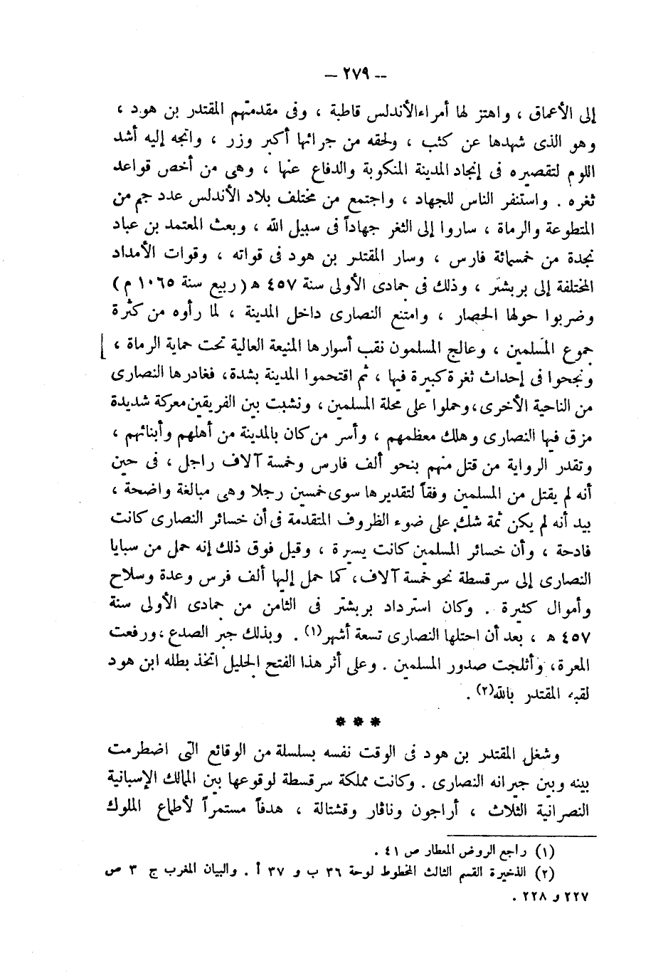 اللوم لتقصيره في إنجاد المدينة المنكوبة والدفاع عنها، وهي من أخص قواعد ثغره. واستنفر الناس للجهاد، واجتمع من مختلف بلاد الأندلس عدد جم من المتطوعة والرماة، ساروا إلى الثغر جهاداً في سبيل الله، وبعث المعتضد بن عباد نجدة من خمسمائة فارس، وسار المقتدر بن هود في قواته، وقوات الأمداد المختلفة إلى بربشتر، وذلك في جمادى الأولى سنة 457 هـ (ربيع سنة 1065 م) وضربوا حولها الحصار، وامتنع النصارى داخل المدينة، لما رأوه من كثرة جموع المسلمين، وعالج المسلمون نقب أسوارها المنيعة العالية تحت حماية الرماة، ونجحوا في إحداث ثغرة كبيرة فيها، ثم اقتحموا المدينة بشدة، فغادرها النصارى من الناحية الأخرى، وحملوا على محلة المسلمين، ونشبت بين الفريقين معركة شديدة مزق فيها النصارى وهلك معظمهم، وأسر من كان بالمدينة من أهلهم وأبنائهم، وتقدر الرواية من قتل منهم بنحو ألف فارس وخمسة آلاف راجل، في حين أنه لم يقتل من المسلمين وفقاً لتقديرها سوى خمسين رجلا وهي مبالغة واضحة، بيد أنه لم يكن ثمة شك على ضوء الظروف المتقدمة في أن خسائر النصارى كانت فادحة، وأن خسائر المسلمين كانت يسيرة، وقيل فوق ذلك إنه حمل من سبايا النصارى إلى سرقسطة نحو خمسة آلاف، كما حمل إليها ألف فرس وعدة وسلاح وأموال كثيرة. وكان استرداد بربشتر في الثامن من جمادى الأولى سنة 457 هـ، بعد أن احتلها النصارى تسعة أشهر (¬1). وبذلك جبر الصدع، ورفعت المعرة، وأثلجت صدور المسلمين. وعلى أثر هذا الفتح الجليل اتخذ بطله ابن هود لقبه المقتدر بالله (¬2).