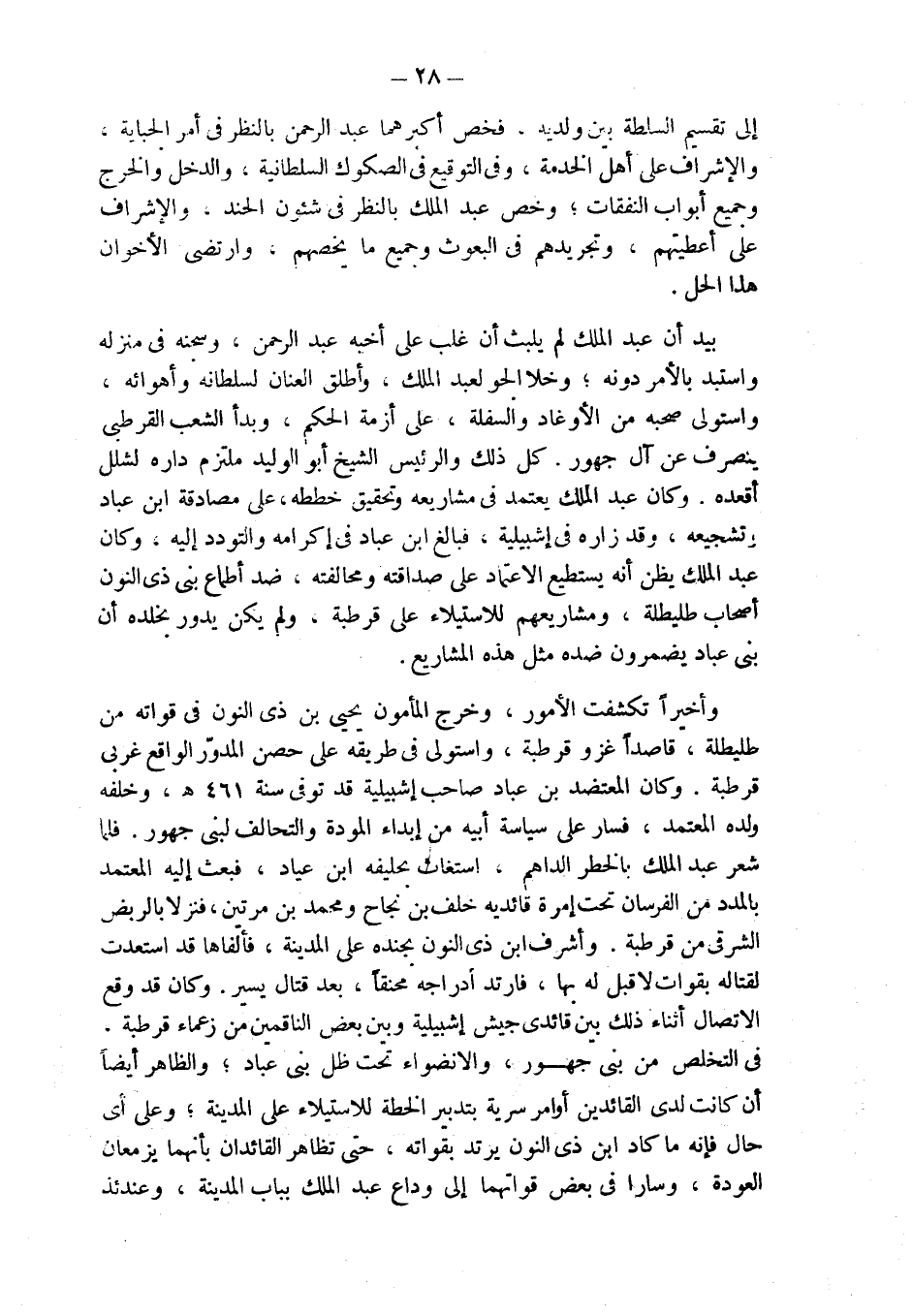 إلى تقسيم السلطة بين ولديه، فخص أكبرهما عبد الرحمن بالنظر في أمر الجباية، والإشراف على أهل الخدمة، وفي التوقيع في الصكوك السلطانية، والدخل والخرج وجميع أبواب النفقات؛ وخص عبد الملك بالنظر في شئون الجند، والإشراف على أعطيتهم، وتجريدهم في البعوث وجميع ما يخصهم، وارتضى الأخوان هذا الحل.