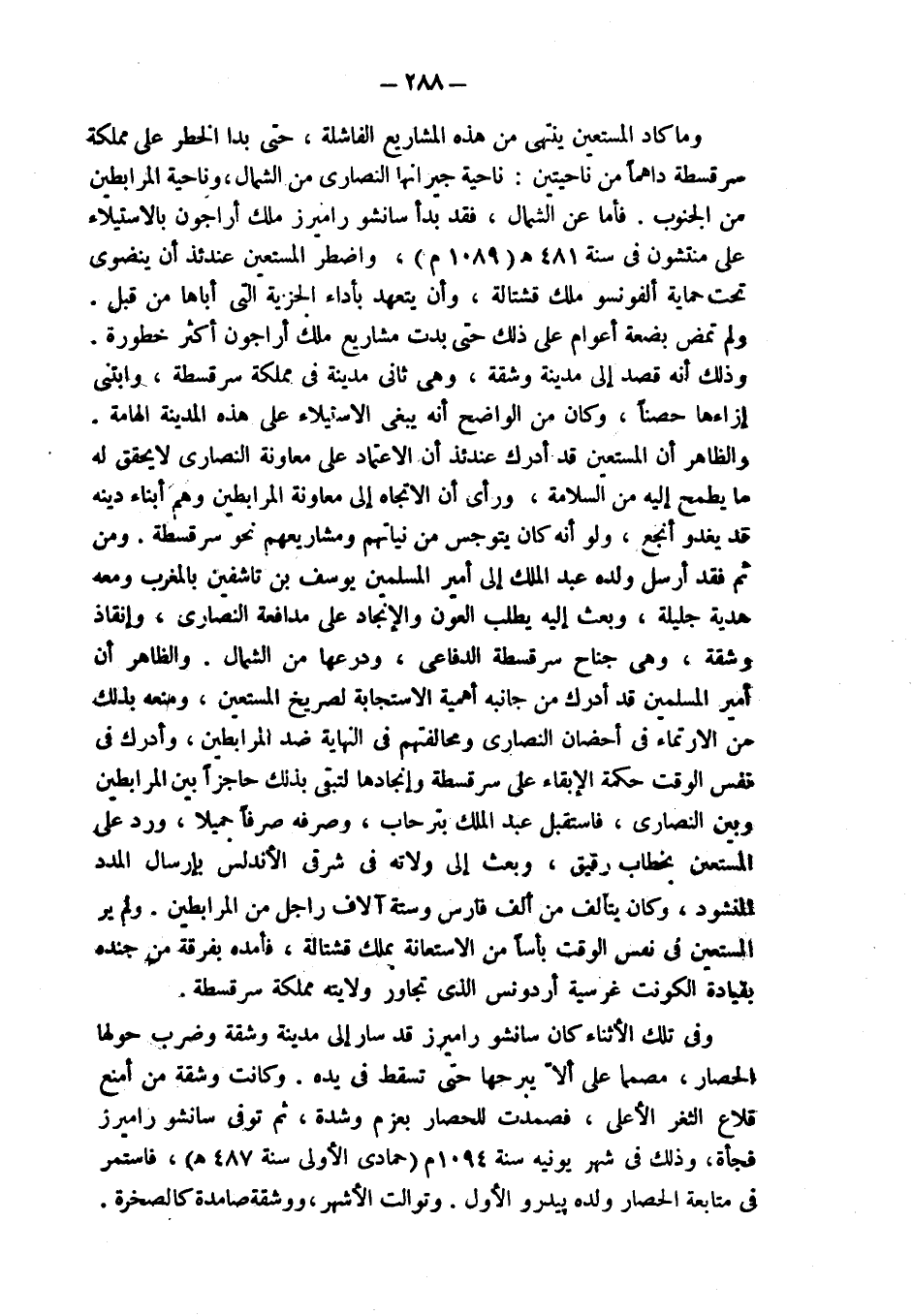 وما كاد المستعين ينتهي من هذه المشاريع الفاشلة، حتى بدا الخطر على مملكة سرقسطة داهماً من ناحيتين: ناحية جيرانها النصارى من الشمال، وناحية المرابطين من الجنوب. فأما عن الشمال، فقد بدأ سانشو راميرز ملك أراجون بالاستيلاء على منتشون في سنة 481 هـ (1089 م)، واضطر المستعين عندئذ أن ينضوي تحت حماية ألفونسو ملك قشتالة، وأن يتعهد بأداء الجزية التي أباها من قبل.
