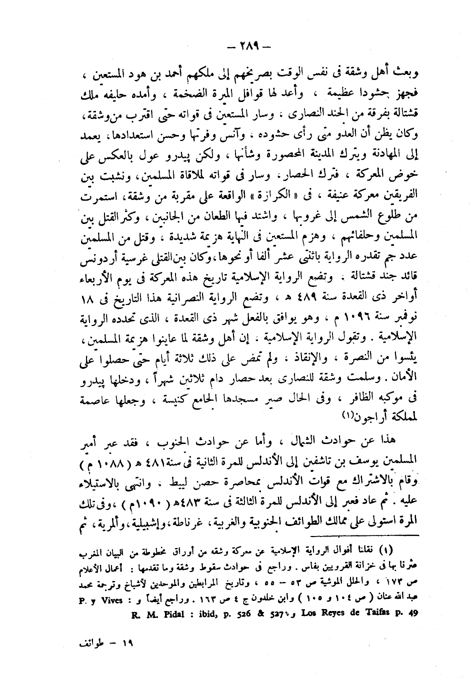 (¬1) نقلنا أقوال الرواية الإسلامية عن معركة وشقة من أوراق مخطوطة من البيان المغرب عثرنا بها في خزانة القرويين بفاس. وراجع في حوادث سقوط وشقة وما تقدمها: أعمال الأعلام ص 173، والحلل الموشية ص 53 - 55، وتاريخ المرابطين والموحدين لأشباخ وترجمة محمد عبد الله عنان (ص 104 و 105) وابن خلدون ج 4 ص 163. وراجع أيضاً: P.y Vives. Los Reyes de Taifas p. 49 و R.M.Pidal: ibid, p. 526 & 527