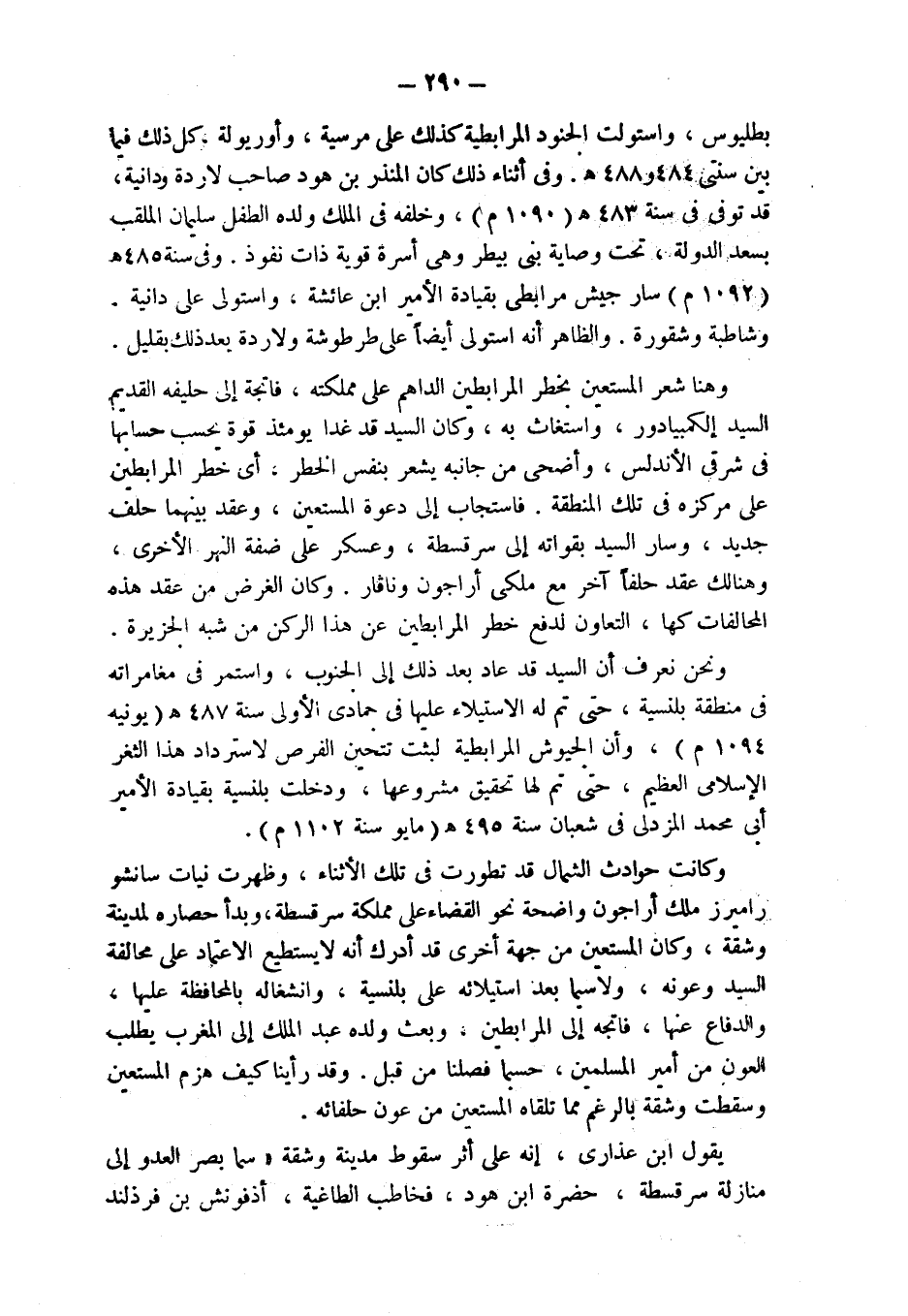 ونحن نعرف أن السيد قد عاد بعد ذلك إلى الجنوب، واستمر في مغامراته في منطقة بلنسية، حتى تم له الاستيلاء عليها في جمادى الأولى سنة 487 هـ (يونيه 1094 م)، وأن الجيوش المرابطية لبثت تتحين الفرص لاسترداد هذا الثغر الإسلامي العظيم، حتى تم لها تحقيق مشروعها، ودخلت بلنسية بقيادة الأمير أبى محمد المزدلي في شعبان سنة 495 هـ (مايو سنة 1102 م).