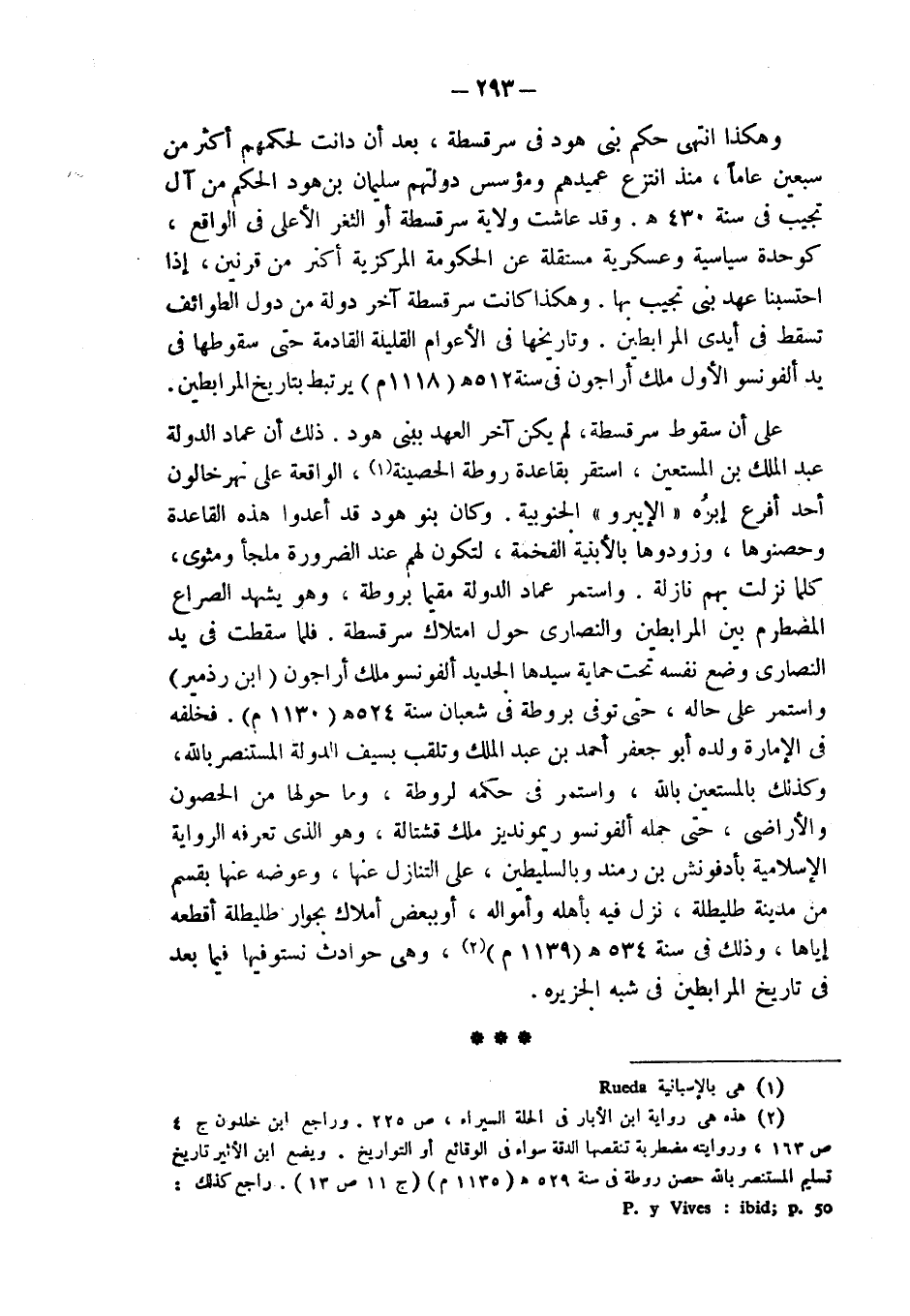 (¬2) هذه هي رواية ابن الأبار في الحلة السيراء، ص 225. وراجع ابن خلدون ج 4 ص 163، وروايته مضطربة تنقصها الدقة سواء في الوقائع أو التواريخ. ويضع ابن الأثير تاريخ تسليم المستنصر بالله حصن روطة في سنة 529 هـ (1135 م) (ج 11 ص 13). راجع كذلك: P.y Vives: ibid ; p. 50