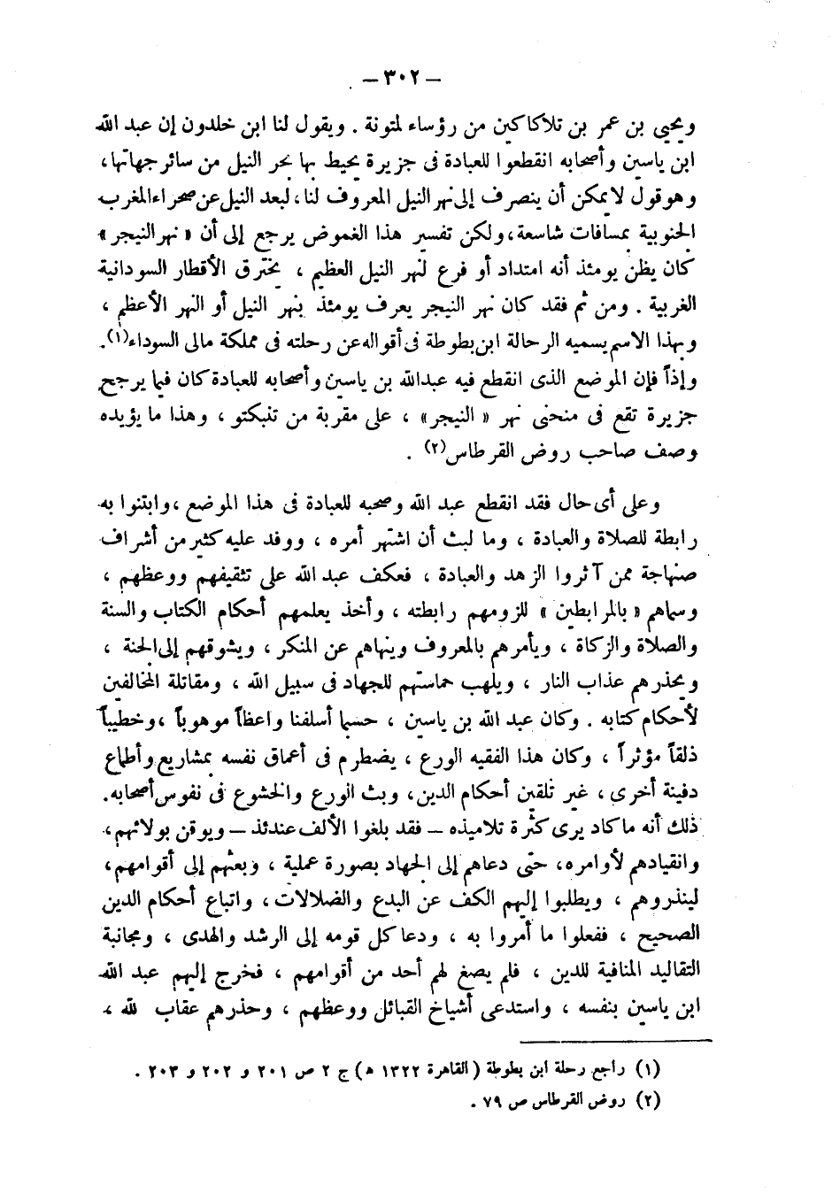 ويحيى بن عمر بن تلاكاكين من رؤساء لمتونة. ويقول لنا ابن خلدون إن عبد الله ابن ياسين وأصحابه انقطعوا للعبادة في جزيرة يحيط بها بحر النيل من سائر جهاتها، وهو قول لا يمكن أن ينصرف إلى نهر النيل المعروف لنا، لبعد النيل عن صحراء المغرب الجنوبية بمسافات شاسعة، ولكن تفسير هذا الغموض يرجع إلى أن " نهر النيجر " كان يظن يومئذ أنه امتداد أو فرع لنهر النيل العظيم، يخترق الأقطار السودانية الغربية. ومن ثم فقد كان نهر النيجر يعرف يومئذ بنهر النيل أو النهر الأعظم، وبهذا الاسم يسميه الرحالة ابن بطوطة في أقواله عن رحلته في مملكة مالي السوداء (¬1).