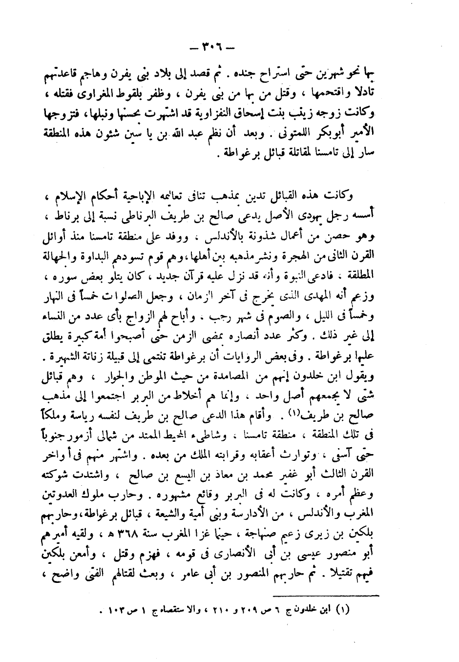 ويقول ابن خلدون إنهم من المصامدة من حيث الوطن والجوار، وهم قبائل شتى لا يجمعهم أصل واحد، وإنما هم أخلاط من البربر اجتمعوا إلى مذهب صالح بن طريف (¬1). وأقام هذا الدعي صالح بن طريف لنفسه رياسة وملكاً في تلك المنطقة، منطقة تامسنا، وشاطىء المحيط الممتد من شمالي أزمور جنوباً حتى آسفي، وتوارث أعقابه وقرابته الملك من بعده. واشتهر منهم في أواخر القرن الثالث أبو غفير محمد بن معاذ بن اليسع بن صالح، واشتدت شوكته وعظم أمره، وكانت له في البربر وقائع مشهورة. وحارب ملوك العدوتين المغرب والأندلس، من الأدارسة وبني أمية والشيعة، قبائل برغواطة، وحاربهم بلكين بن زيري زعيم صنهاجة، حينما غزا المغرب سنة 368 هـ، ولقيه أميرهم أبو منصور عيسى بن أبي الأنصاري في قومه، فهزم وقتل، وأمعن بلكين فيهم تقتيلا. ثم حاربهم المنصور بن أبي عامر، وبعث لقتالهم الفتى واضح،