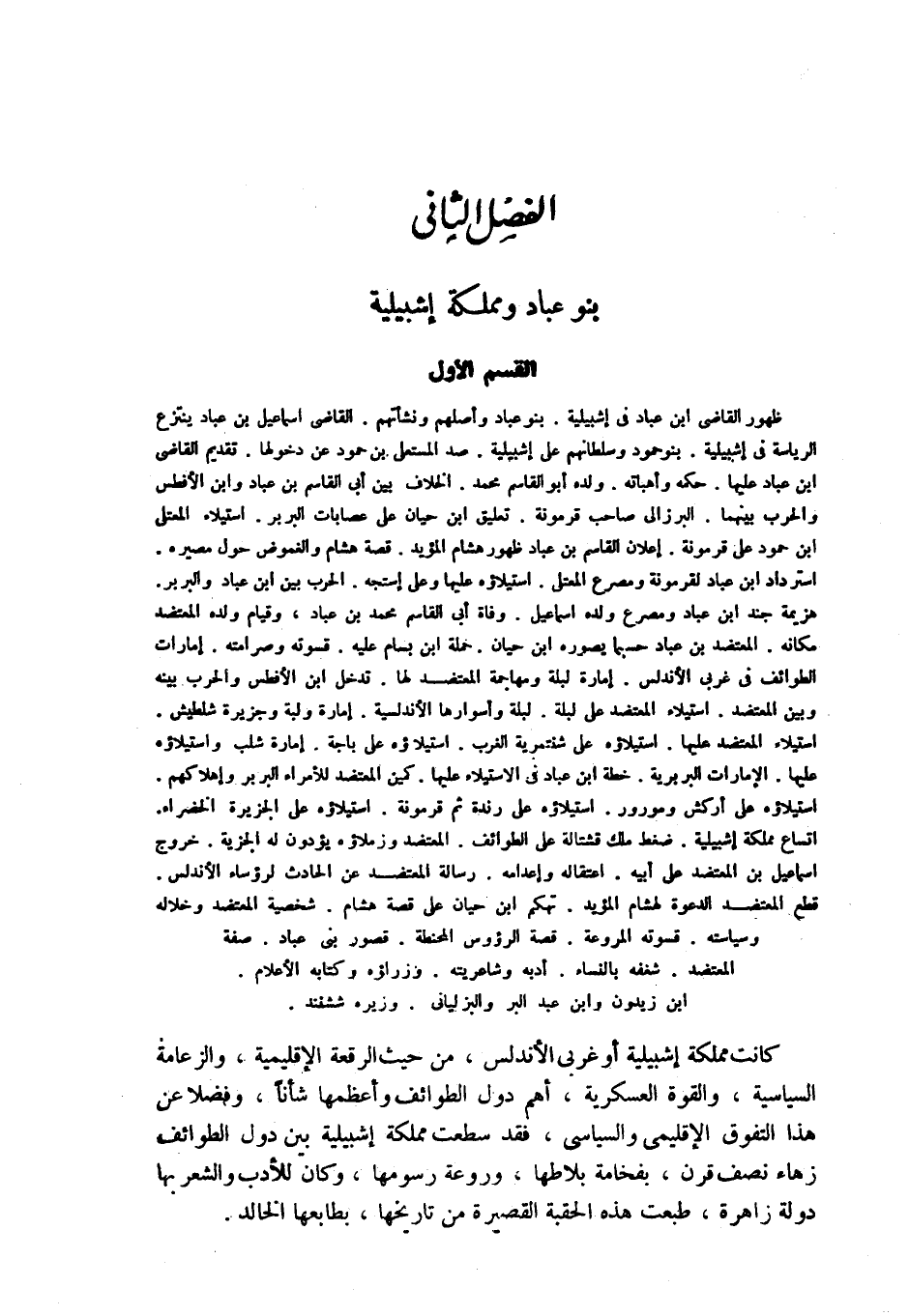 ظهور القاضي ابن عباد في إشبيلية. بنو عباد وأصلهم ونشأتهم. القاضي اسماعيل بن عباد ينتزع الرياسة في إشبيلية. بنو حمود وسلطانهم على إشبيلية. صد المستعلي بن حمود عن دخولها. تقديم القاضي ابن عباد عليها. حكمه وأهباته. ولده أبو القاسم محمد. الخلاف بين أبي القاسم بن عباد وابن الأفطس والحرب بينهما. البرزالي صاحب قرمونة. تعليق ابن حيان على عصابات البربر. استيلاء المعتلي ابن حمود على قرمونة. إعلان القاسم بن عباد ظهور هشام المؤيد. قصة هشام والغموض حول مصيره. استرداد ابن عباد لقرمونة ومصرع المعتلي. استيلاؤه عليها وعلى إستجه. الحرب بين ابن عباد والبربر. هزيمة جند ابن عباد ومصرع ولده اسماعيل. وفاة أبي القاسم محمد بن عباد، وقيام ولده المعتمد مكانه. المعتضد بن عباد حسبما يصوره ابن حيان. حملة ابن بسام عليه. قسوته وصرامته. إمارات الطوائف في غربي الأندلس. إمارة لبلة ومهاجمة المعتضد لها. تدخل ابن الأفطس والحرب بينه وبين المعتضد. استيلاء المعتضد على لبلة. لبلة وأسوارها الأندلسية. إمارة ولبة وجزيرة شلطيش. استيلاء المعتضد عليها. استيلاؤه على شنتمرية الغرب. استيلاؤه على باجة. إمارة شلب واستيلاؤه عليها. الإمارات البربرية. خطة ابن عباد في الاستيلاء عليها. كمين المعتضد للأمراء البربر وإهلاكهم. استيلاؤه عل أركش ومورور. استيلاؤه على رندة ثم قرمونة. استيلاؤه على الجزيرة الخضراء. اتساع مملكة إشبيلية. ضغط ملك قشتالة على الطوائف. المعتضد وزملاؤه يؤدون له الجزية. خروج اسماعيل بن المعتضد على أبيه. اعتقاله وإعدامه. رسالة المعتضد عن الحادث لرؤساء الأندلس. قطع المعتضد الدعوة لهشام المؤيد. تهكم ابن حيان على قصة هشام. شخصية المعتضد وخلاله وسياسته. قسوته المروعة. قصة الرؤوس المحنطة. قصور بني عباد. صفة المعتضد. شغفه بالنساء. أدبه وشاعريته. وزراؤه وكتابه الأعلام. ابن زيدون وابن عبد البر والبزلياني. وزيره ششقند.