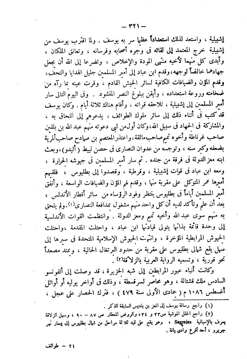 (¬2) راجع الحلل الموشية ص 33 و 34، والروض المعطار ص 87 - 90، وسهل الزلاقة يعرف بالإسبانية Sagrajas، وهو يقع على قيد ثلاثة مراحل من شمال بطليوس إلى يسار نهر جريرو، أحد أفرع وادي يانة.