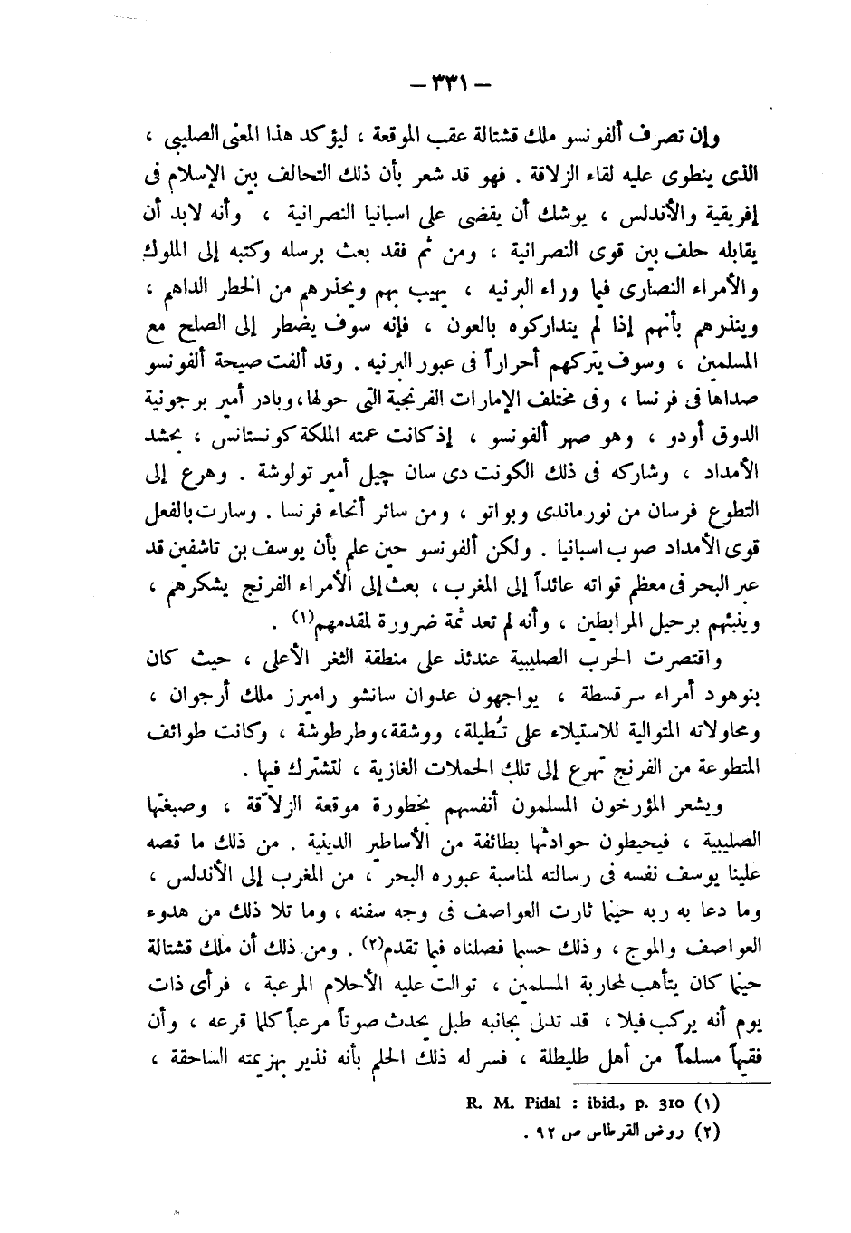 ويشعر المؤرخون المسلمون أنفسهم بخطورة موقعة الزلاّقة، وصبغتها الصليبية، فيحيطون حوادثها بطائفة من الأساطير الدينية. من ذلك ما قصه علينا يوسف نفسه في رسالته لمناسبة عبوره البحر، من المغرب إلى الأندلس، وما دعا به ربه حينما ثارت العواصف في وجه سفنه، وما تلا ذلك من هدوء العواصف والموج، وذلك حسبما فصلناه فيما تقدم (¬2). ومن ذلك أن ملك قشتالة حينما كان يتأهب لمحاربة المسلمين، توالت عليه الأحلام المرعبة، فرأى ذات يوم أنه يركب فيلا، قد تدلى بجانبه طبل يحدث صوتاً مرعباً كلما قرعه، وأن فقيهاً مسلماً من أهل طليطلة، فسر له ذلك الحلم بأنه نذير بهزيمته الساحقة،
