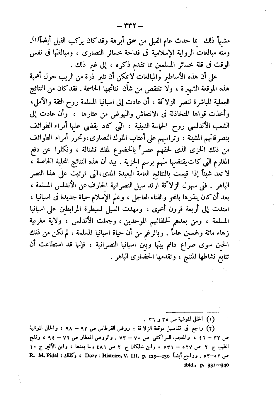 (¬2) راجع في تفاصيل موقعة الزلاقة: روض القرطاس ص 93 - 98، والحلل الموشية ص 33 - 46، والمعجب للمراكشي ص 70 - 73. والروض المعطار ص 76 - 94، ونفح الطيب ج 2 ص 527 - 531، وابن خلكان ج 2 ص 481 وما بعدها، وابن الأثير ج 10 ص 52 - 53. وراجع أيضاً Dozy: Histoire, V.III.p. 129-130، وكذلك R.M.Pidal.ibid ; p. 331-340