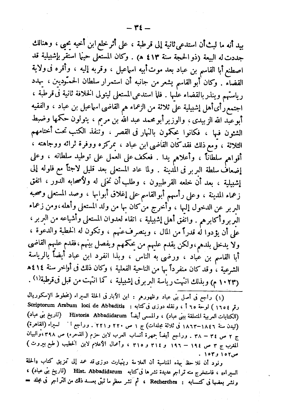 (¬1) راجع في أصل بني عباد وظهورهم: ابن الأبار في الحلة السيراء (مخطوط الإسكوريال رقم 1654) لوحة 65 أ، ونقله دوزي في كتابه: Scriptorum Arabum Loci de Abbaditis ( الكتابات العربية المتعلقة ببني عباد)، والمسمى أيضاً Historia Abbadidarum ( تاريخ بني عباد) (ليدن سنة 1846 - 1863 في ثلاثة مجلدات) ج 1 ص 220 و 221. وراجع الحلة السيراء (القاهرة) ج 2 ص 34 - 38. وراجع أيضاً جمهرة أنساب العرب لابن حزم (القاهرة) ص 398، والبيان المغرب ج 3 ص 194 - 196 و 314 و 315، وأعمال الأعلام لابن الخطيب (طبع بيروت) ص 152 و 153.