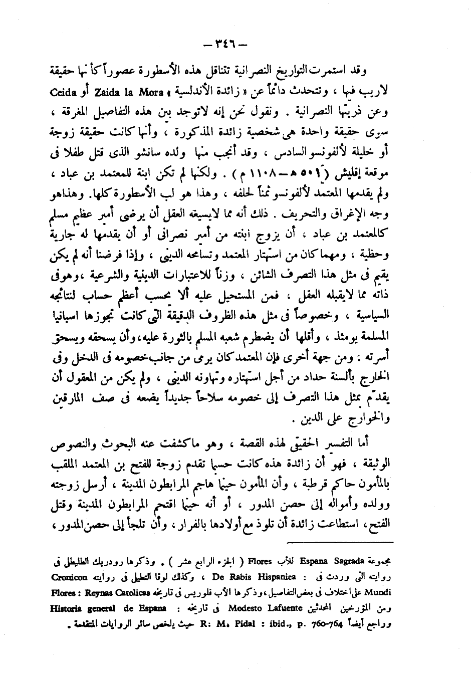 وقد استمرت التواريخ النصرانية تتناقل هذه الأسطورة عصوراً كأنها حقيقة لا ريب فيها، وتتحدث دائماً عن " زائدة الأندلسية " Zeida la Mora أو Ceida وعن ذريتها النصرانية. ونقول نحن إنه لا توجد بين هذه التفاصيل المغرقة، سوى حقيقة واحدة هي شخصية زائدة المذكورة، وأنها كانت حقيقة زوجة أو خليلة لألفونسو السادس، وقد أنجب منها ولده سانشو الذي قتل طفلا في موقعة إقليش (501 هـ - 1108 م). ولكنها لم تكن ابنة للمعتمد بن عباد، ولم يقدمها المعتمد لألفونسو ثمناً لحلفه، وهذا هو لب الأسطورة كلها. وهذا هو وجه الإغراق والتحريف. ذلك أنه مما لا يسيغه العقل أن يرضى أمير عظيم مسلم كالمعتمد بن عباد، أن يزوج ابنته من أمير نصراني أو أن يقدمها له جارية وحظية، ومهما كان من استهتار المعتمد وتسامحه الديني، وإذا فرضنا أنه لم يكن يقيم في مثل هذا التصرف الشائن، وزناً للاعتبارات الدينية والشرعية، وهو في ذاته مما لا يقبله العقل، فمن المستحيل عليه ألا يحسب أعظم حساب لنتائجه السياسية، وخصوصاً في مثل هذه الظروف الدقيقة التي كانت تجوزها اسبانيا المسلمة يومئذ، وأقلها أن يضطرم شعبه المسلم بالثورة عليه، وأن يسحقه ويسحق أسرته، ومن جهة أخرى فإن المعتمد كان يرمي من جانب خصومه في الداخل وفي الخارج بألسنة حداد من أجل استهتاره وتهاونه الديني، ولم يكن من المعقول أن يقدّم بمثل هذا التصرف إلى خصومه سلاحاً جديداً يضعه في صف المارقين والخوارج على الدين.