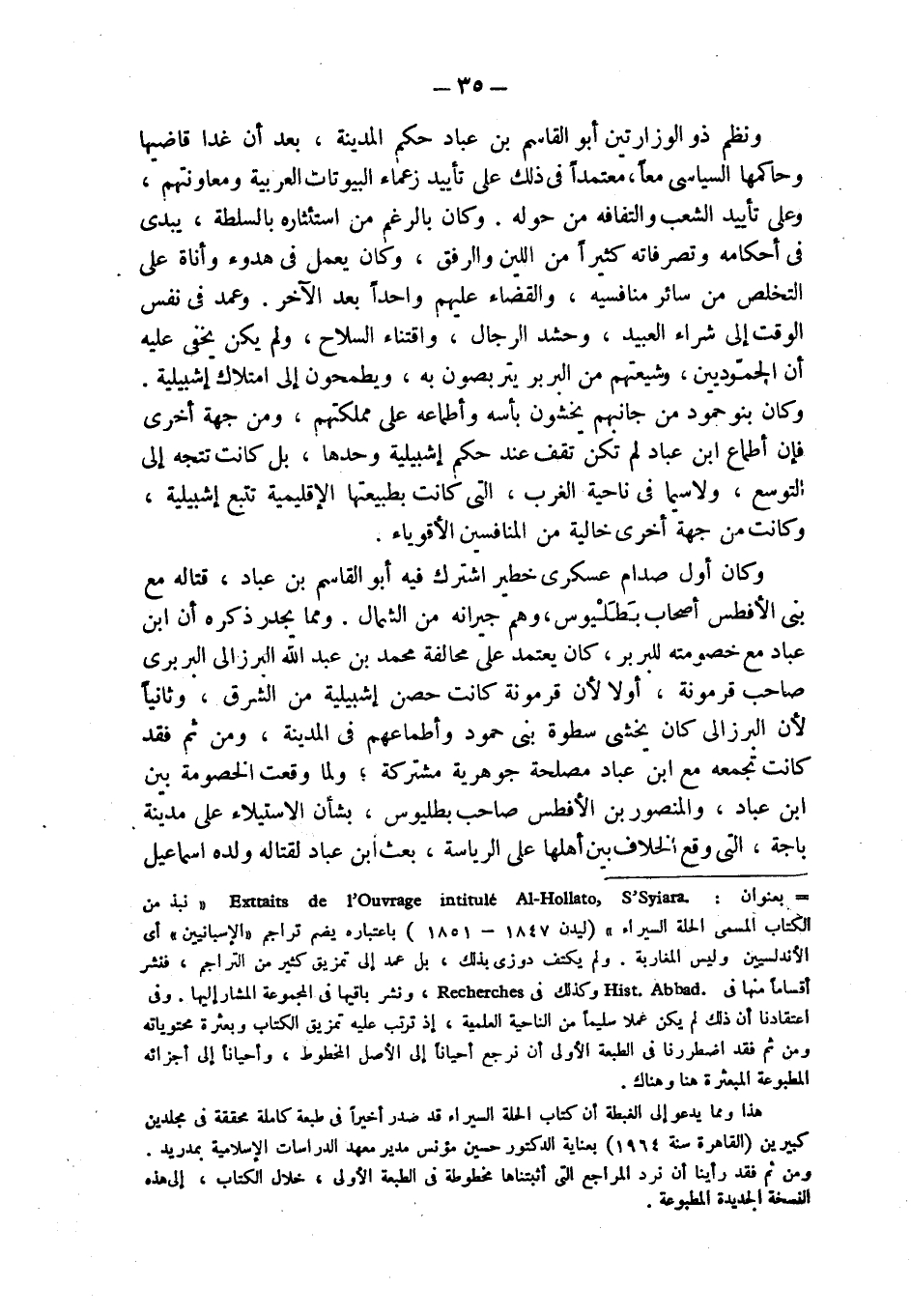 = بعنوان: Extraits de l'Ouvrage intitulé Al - Hollato, S'Syiara. " نبذ من الكتاب المسمى الحلة السيراء " (ليدن 1847 - 1851) باعتباره يضم تراجم " الإسبانيين " أي الأندلسيين وليس المغاربة. ولم يكتف دوزي بذلك، بل عمد إلى تمزيق كثير من التراجم، فنشر أقساماً منها في Hist. Abbad. وكذلك في Recherches، ونشر باقيها في المجموعة المشار إليها. وفي اعتقادنا أن ذلك لم يكن عملا سليماً من الناحية العلمية، إذ ترتب عليه تمزيق الكتاب وبعثرة محتوياته ومن ثم فقد اضطررنا في الطبعة الأولى أن نرجع أحياناً إلى الأصل المخطوط، وأحياناً إلى أجزائه المطبوعة المبعثرة هنا وهناك.
