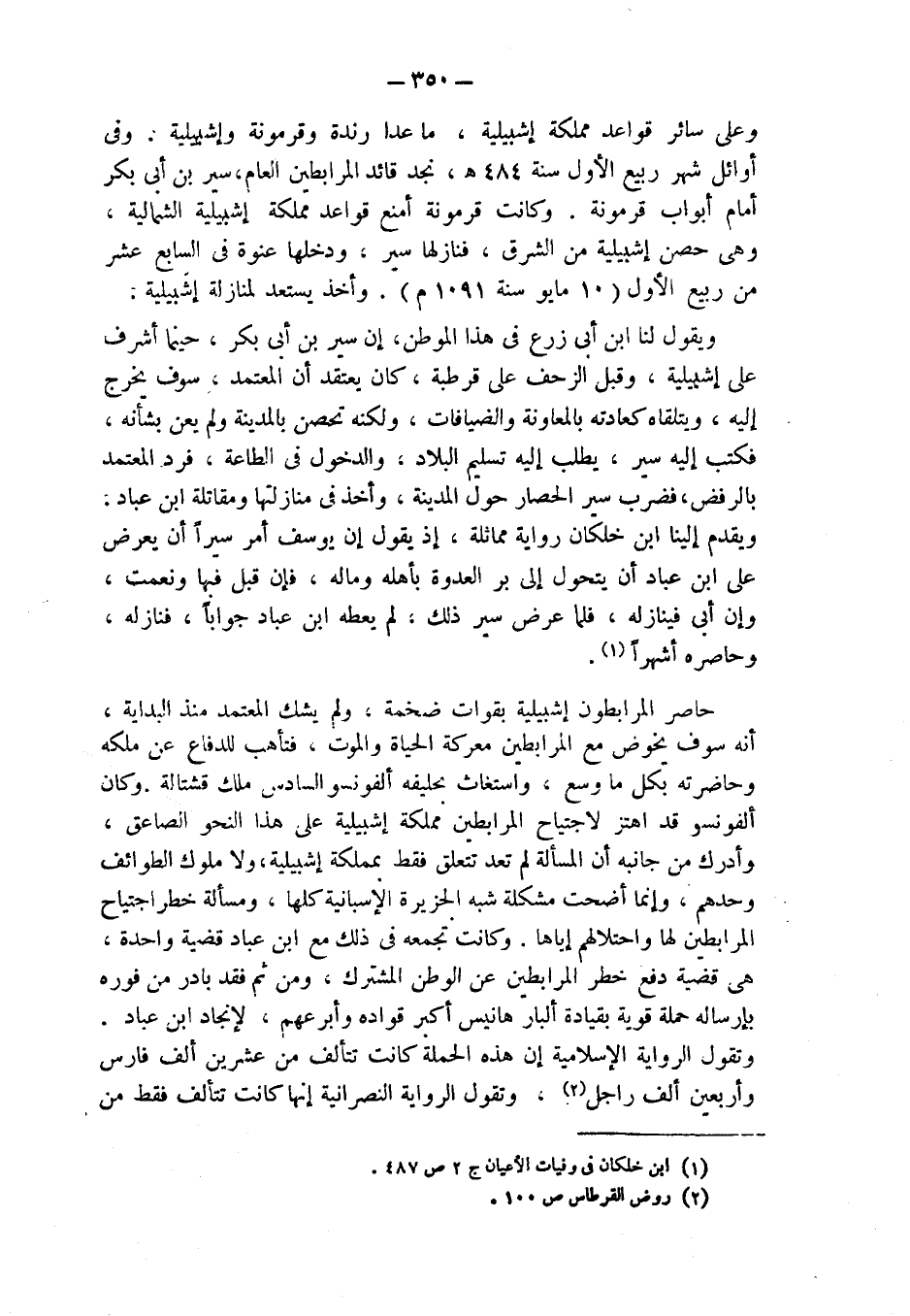 ويقول لنا ابن أبي زرع في هذا الموطن، إن سير بن أبى بكر، حينما أشرف على إشبيلية، وقبل الزحف على قرطبة، كان يعتقد أن المعتمد، سوف يخرج إليه، ويتلقاه كعادته بالمعاونة والضيافات، ولكنه تحصن بالمدينة ولم يعن بشأنه، فكتب إليه سير يطلب إليه تسليم البلاد، والدخول في الطاعة، فرد المعتمد بالرفض، فضرب سير الحصار حول المدينة، وأخذ في منازلتها ومقاتلة ابن عباد، ويقدم إلينا ابن خلكان رواية مماثلة، إذ يقول إن يوسف أمر سيراً أن يعرض على ابن عباد أن يتحول إلى بر العدوة بأهله وماله، فإن قبل فبها ونعمت، وإن أبى فينازله، فلما عرض سير ذلك، لم يعطه ابن عباد جواباً، فنازله، وحاصره أشهراً (¬1).