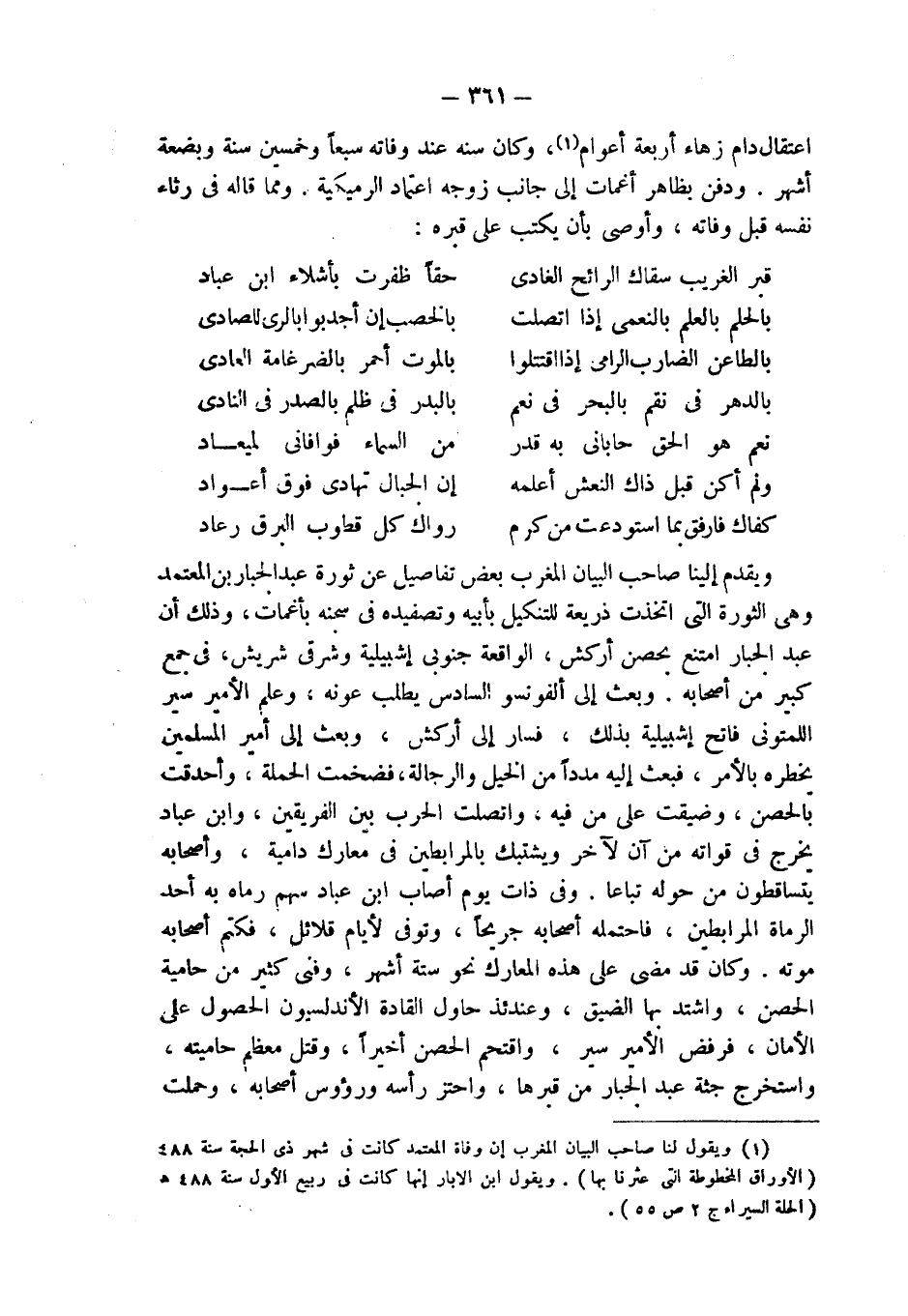 (¬1) ويقول لنا صاحب البيان المغرب إن وفاة المعتمد كانت في شهر ذي الحجة سنة 488 هـ (الأوراق المخطوطة التي عثرنا بها). ويقول ابن الأبار إنها كانت في ربيع الأول سنة 488 هـ (الحلة السيراء ج 2 ص 55).