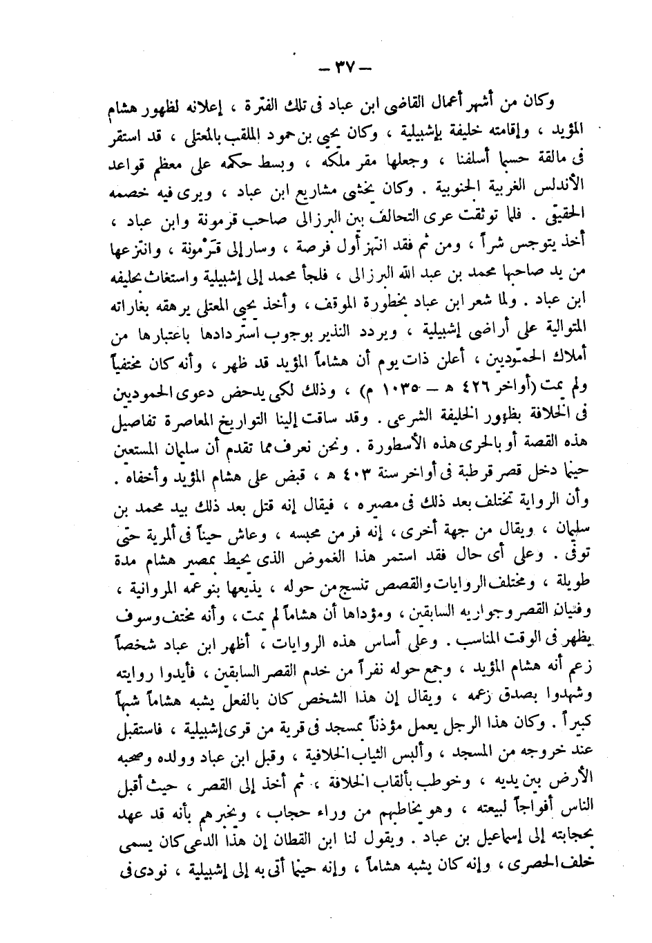 وكان من أشهر أعمال القاضي ابن عباد في تلك الفترة، إعلانه لظهور هشام ْالمؤيد، وإقامته خليفة بإشبيلية، وكان يحيى بن حمود الملقب بالمعتلي، قد استقر في مالقة حسبما أسلفنا، وجعلها مقر ملكه، وبسط حكمه على معظم قواعد الأندلس الغربية الجنوبية. وكان يخشى مشاريع ابن عباد، ويرى فيه خصمه الحقيقي. فلما توثقت عري التحالف بين البرزالي صاحب قرمونة وابن عباد، أخذ يتوجس شراً، ومن ثم فقد انتهز أول فرصة، وسار إلى قَرْمونة، وانتزعها من يد صاحبها محمد بن عبد الله البرزالي، فلجأ محمد إلى إشبيلية واستغاث بحليفه ابن عباد. ولما شعر ابن عباد بخطورة الموقف، وأخذ يحيى المعتلي يرهقه بغاراته المتوالية على أراضي إشبيلية، ويردد النذير بوجوب استردادها باعتبارها من أملاك الحمّوديين، أعلن ذات يوم أن هشاماً المؤيد قد ظهر، وأنه كان مختفياً ولم يمت (أواخر 426 هـ - 1035 م)، وذلك لكي يدحض دعوى الحموديين في الخلافة بظهور الخليفة الشرعي. وقد ساقت إلينا التواريخ المعاصرة تفاصيل هذه القصة أو بالحري هذه الأسطورة. ونحن نعرف مما تقدم أن سليمان المستعين حينما دخل قصر قرطبة في أواخر سنة 403 هـ، قبض على هشام المؤيد وأخفاه.