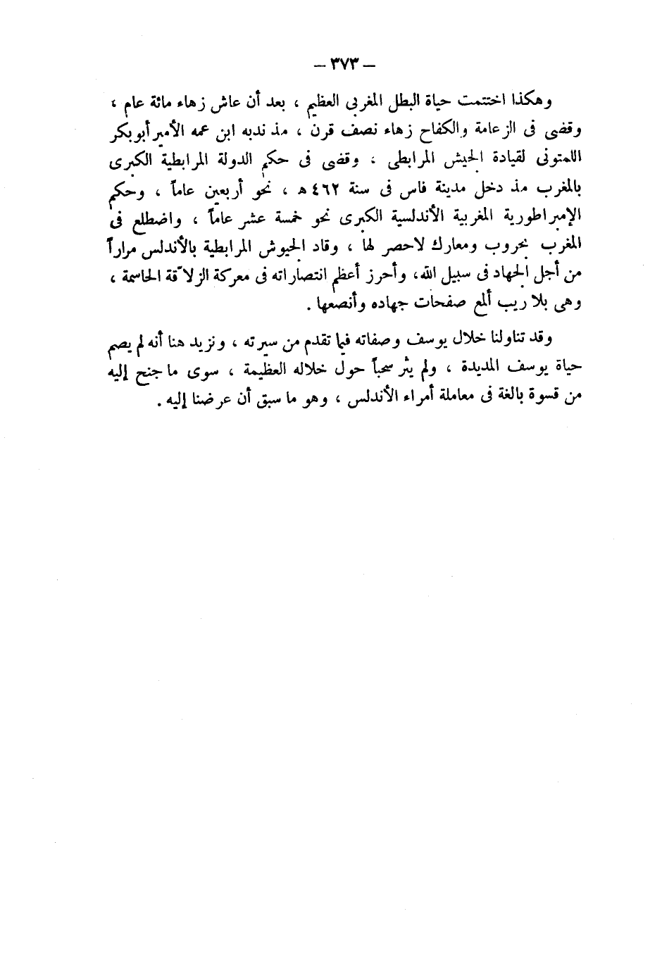 وهكذا اختتمت حياة البطل المغربي العظيم، بعد أن عاش زهاء مائة عام، وقضى في الزعامة والكفاح زهاء نصف قرن، مذ ندبه ابن عمه الأمير أبو بكر اللمتوني لقيادة الجيش المرابطي، وقضى في حكم الدولة المرابطية الكبرى بالمغرب مذ دخل مدينة فاس في سنة 462 هـ، نحو أربعين عاماً، وحكم الإمبراطورية المغربية الأندلسية الكبرى نحو خمسة عشر عاماً، واضطلع في المغرب بحروب ومعارك لا حصر لها، وقاد الجيوش المرابطية بالأندلس مراراً من أجل الجهاد في سبيل الله، وأحرز أعظم انتصاراته في معركة الزلاّقة الحاسمة، وهي بلا ريب ألمع صفحات جهاده وأنصعها.