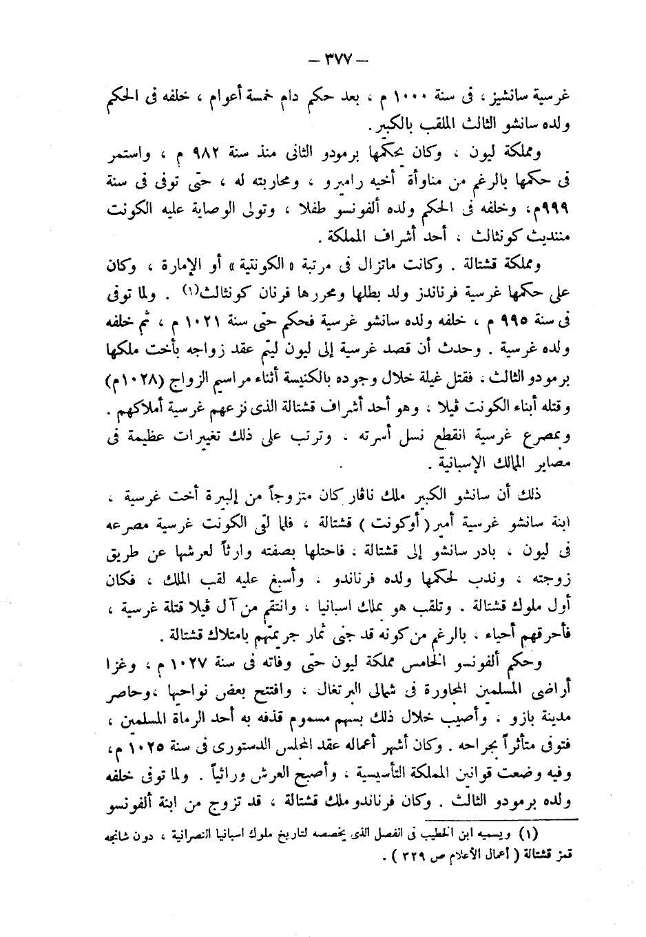ومملكة قشتالة. وكانت ما تزال في مرتبة " الكونتية " أو الإمارة، وكان على حكمها غرسية فرناندز ولد بطلها ومحررها فرنان كونثالث (¬1). ولما توفي في سنة 995 م، خلفه ولده سانشو غرسية فحكم حتى سنة 1021 م، ثم خلفه ولده غرسية. حدث أن قصد غرسية إلى ليون ليتم عقد زواجه بأخت ملكها برمودو الثالث، فقتل غيلة خلال وجوده بالكنيسة أثناء مراسيم الزواج (1028 م) وقتله أبناء الكونت فيلا، وهو أحد أشراف قشتالة الذي نزعهم غرسية أملاكهم.