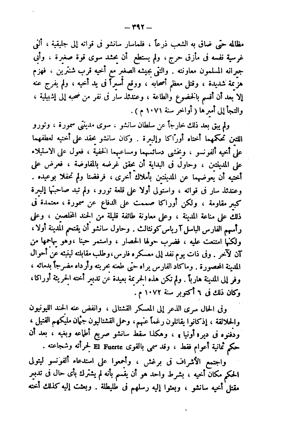 مظالمه حتى ضاق به الشعب ذرعاً، فلما سار سانشو في قواته إلى جليقية، ألفى غرسية نفسه في مأزق حرج، ولم يستطع أن يحشد سوى قوة صغيرة، وأبى جيرانه المسلمون معاونته. والتقى بجيشه الصغير مع أخيه قرب شنترين، فهزم هزيمة شديدة، وقتل معظم أصحابه، ووقع أسيراً في يد أخيه، ولم يفرج عنه إلا بعد أن أقسم بالخضوع والطاعة، وعندئذ سار في نفر من صحبه إلى إشبيلية، والتجأ إلى أميرها (أواخر سنة 1071 م).