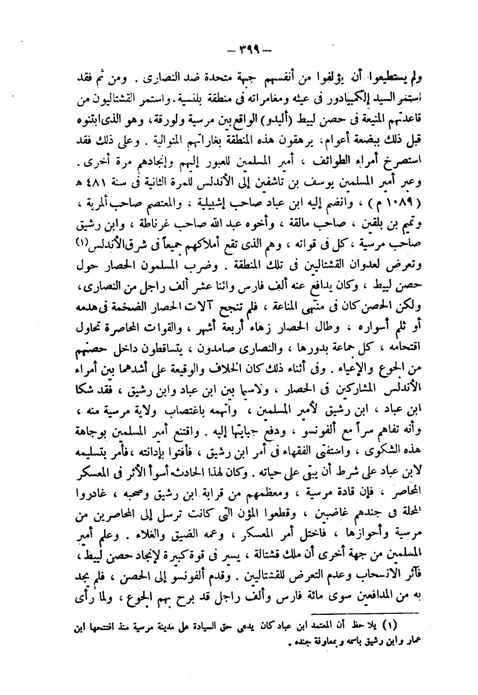 (¬1) يلاحظ أن المعتمد ابن عباد كان يدعى حق السيادة على مدينة مرسية منذ افتتحها ابن عمار وابن رشيق باسمه وبمعاونة جنده.