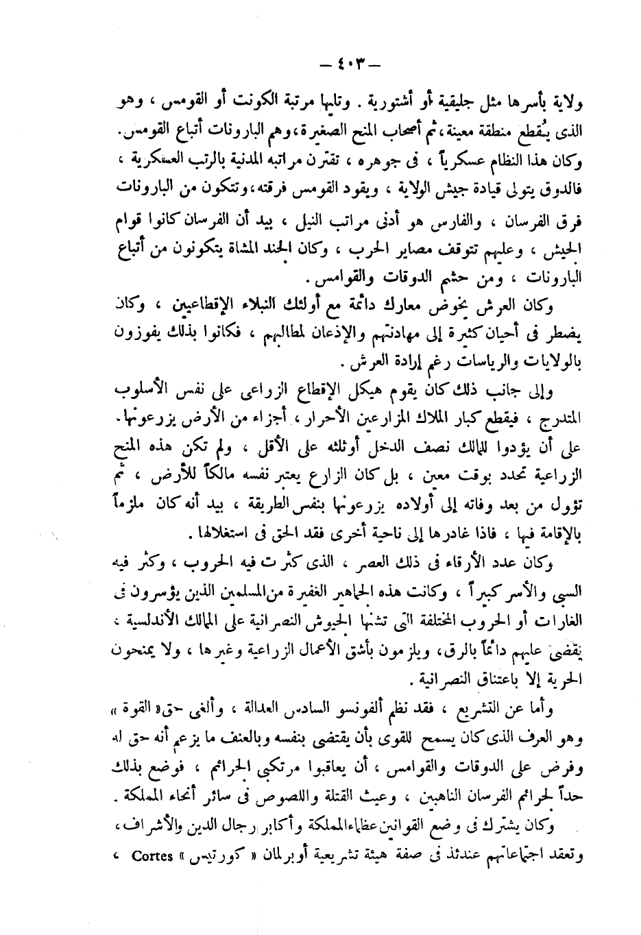 ولاية بأسرها مثل جليقية أو أشتورية. وتليها مرتبة الكونت أو القومس، وهو الذي يُقطع منطقة معينة، ثم أصحاب المنح الصغيرة، وهم البارونات أتباع القومس.