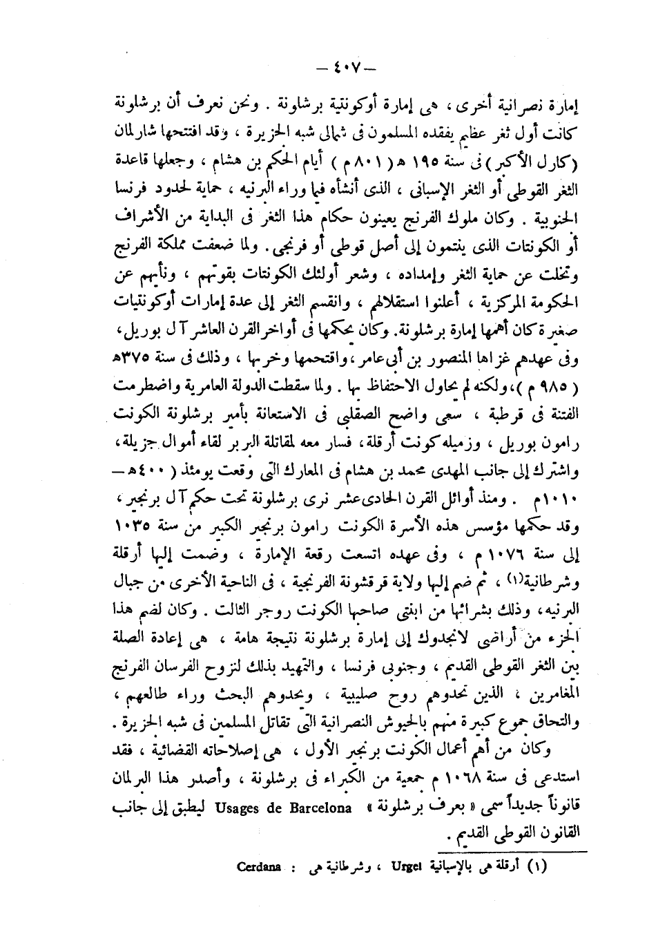 إمارة نصرانية أخرى، هي إمارة أوكونتية برشلونة. ونحن نعرف أن برشلونة كانت أول ثغر عظيم يفقده المسلمون في شمالي شبه الجزيرة، وقد افتتحها شارلمان (كارل الأكبر) في سنة 185 هـ (801 م) أيام الحكم بن هشام، وجعلها قاعدة الثغر القوطي أو الثغر الإسباني، الذي أنشأه فيما وراء البرنيه، حماية لحدود فرنسا الجنوبية. وكان ملوك الفرنج يعينون حكام هذا الثغر في البداية من الأشراف أو الكونتات الذين ينتمون إلى أصل قوطي أو فرنجي. ولما ضعفت مملكة الفرنج وتخلت عن حماية الثغر وإمداده، وشعر أولئك الكونتات بقوتهم، ونأيهم عن الحكومة المركزية، أعلنوا استقلالهم، وانقسم الثغر إلى عدة إمارات أوكونتيات صغيرة كان أهمها إمارة برشلونة. وكان يحكمها في أواخر القرن العاشر آل بوريل، وفي عهدهم غزاها المنصور بن أبي عامر، واقتحمها وخربها، وذلك في سنة 375 هـ (985 م)، ولكنه لم يحاول الاحتفاظ بها. ولما سقطت الدولة العامرية واضطرمت الفتنة في قرطبة، سعي واضح الصقلبي في الاستعانة بأمير برشلونة الكونت رامون بوريل، وزميله كونت أرقلة، فسار معه لمقاتلة البربر لقاء أموال جزيلة، واشترك إلى جانب المهدي محمد بن هشام في المعارك التي وقعت يومئذ (400 هـ - 1010 م). ومنذ أوائل القرن الحادي عشر نرى برشلونة تحت حكم آل برنجير، وقد حكمها مؤسس هذه الأسرة الكونت رامون برنجير الكبير من سنة 1035 إلى سنة 1076 م، وفي عهده اتسعت رقعة الإمارة، وضمت إليها أرقلة وشرطانية (¬1)، ثم ضم إليها ولاية قرقشونة الفرنجية، في الناحية الأخرى من جبال البرنيه، وذلك بشرائها من ابنتى صاحبها الكونت روجر الثالث. وكان لضم هذا الجزء من أراضي لانجدوك إلى إمارة برشلونة نتيجة هامة، هي إعادة الصلة بين الثغر القوطي القديم، وجنوب فرنسا، والتمهيد بذلك لنزوح الفرسان الفرنج المغامرين، الذين تحدوهم روح صليبية، ويحدوهم البحث وراء طالعهم، والتحاق جموع كبيرة منهم بالجيوش النصرانية التي تقاتل المسلمين في شبه الجزيرة.