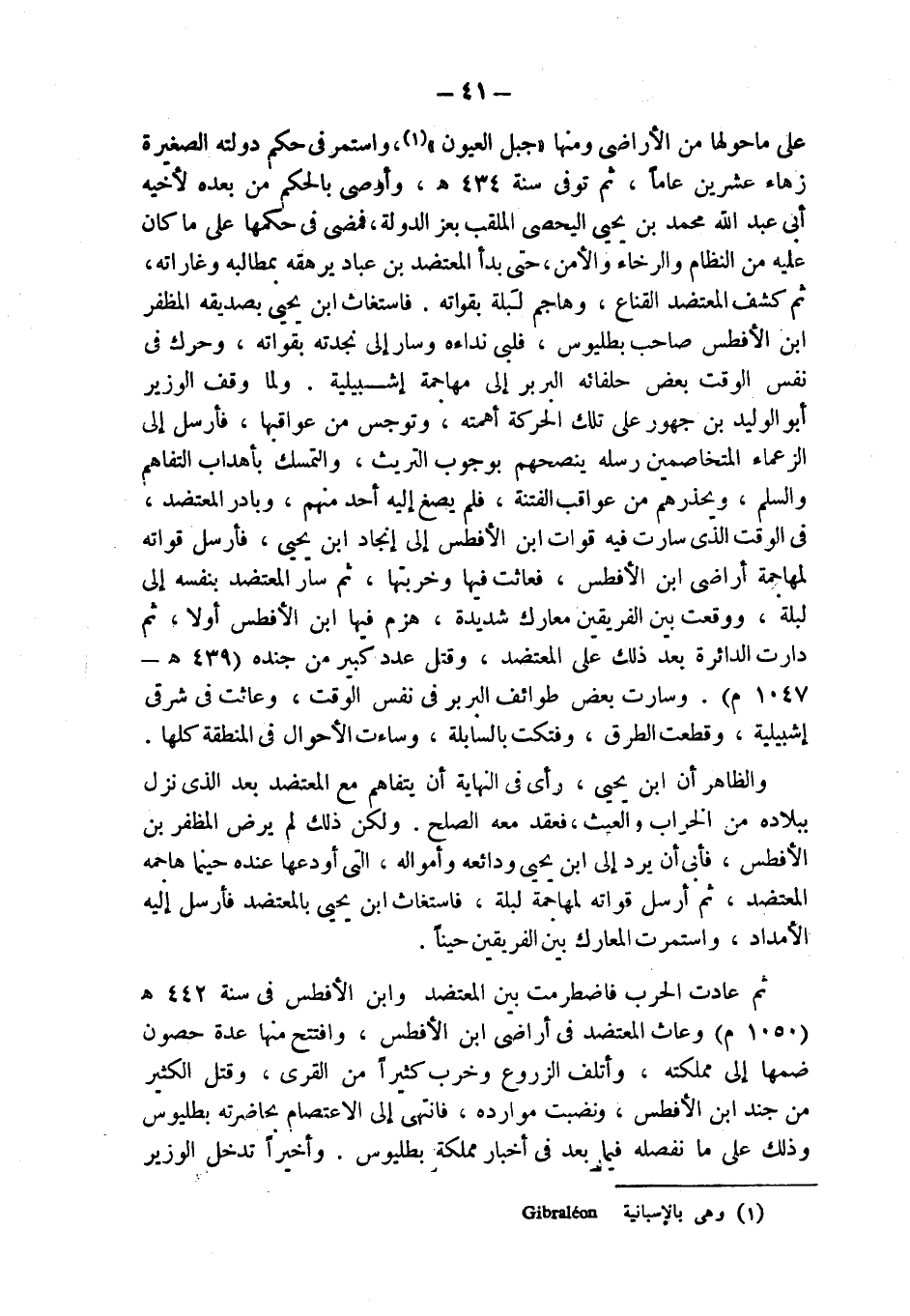 على ما حولها من الأراضي ومنها "جبل العيون" (¬1)، واستمر في حكم دولته الصغيرة زهاء عشرين عاماً، ثم توفي سنة 434 هـ، وأوصى بالحكم من بعده لأخيه أبي عبد الله محمد بن يحيى اليحصبي الملقب بعز الدولة، فمضى في حكمها على ما كان عليه من النظام والرخاء والأمن، حتى بدأ المعتضد بن عباد يرهقه بمطالبه وغاراته، ثم كشف المعتضد القناع، وهاجم لَبلة بقواته. فاستغاث ابن يحيى بصديقه المظفر ابن الأفطس صاحب بطليوس، فلبى نداءه وسار إلى نجدته بقواته، وحرك في نفس الوقت بعض حلفائه البربر إلى مهاجمة إشبيلية. ولما وقف الوزير أبو الوليد بن جهور على تلك الحركة أهمته، وتوجس من عواقبها، فأرسل إلى الزعماء المتخاصمين رسله ينصحهم بوجوب التريث، والتمسك بأهداب التفاهم والسلم، ويحذرهم من عواقب الفتنة، فلم يصغ إليه أحد منهم، وبادر المعتضد، في الوقت الذي سارت فيه قوات ابن الأفطس إلى إنجاد ابن يحيى، فأرسل قواته لمهاجمة أراضي ابن الأفطس، فعاثت فيها وخربتها، ثم سار المعتضد بنفسه إلى لبلة، ووقعت بين الفريقين معارك شديدة، هزم فيها ابن الأفطس أولا، ثم دارت الدائرة بعد ذلك على المعتضد، وقتل عدد كبير من جنده (439 هـ - 1047 م). وسارت بعض طوائف البربر في نفس الوقت، وعاثت في شرقي إشبيلية، وقطعت الطرق، وفتكت بالسابلة، وساءت الأحوال في المنطقة كلها.