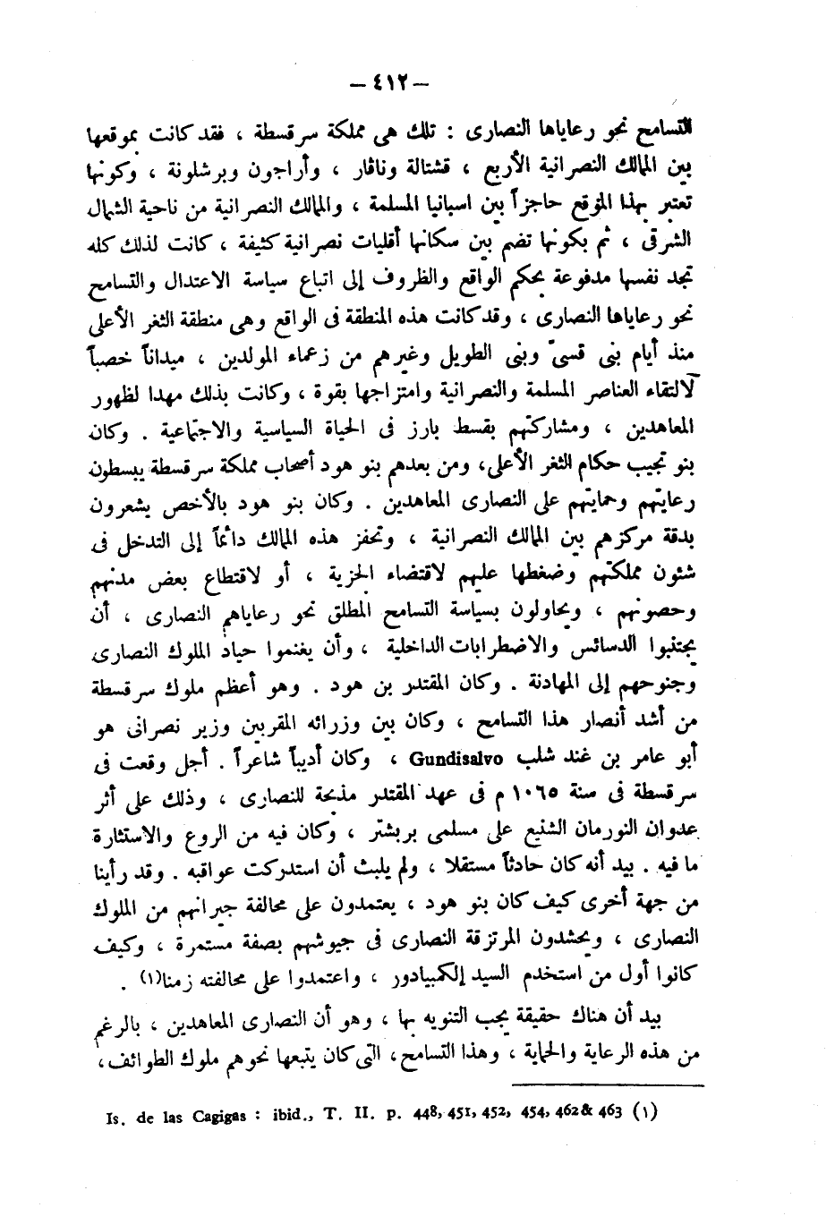 التسامح نحو رعاياها النصارى: تلك هي مملكة سرقسطة، فقد كانت بموقعها بين الممالك النصرانية الأربع، قشتالة ونافار، وأراجون وبرشلونة، وكونها تعتبر بهذا الوقع حاجزاً بين اسبانيا المسلمة، والممالك النصرانية من ناحية الشمال الشرقي، ثم بكونها تضم بين سكانها أقليات نصرانية كثيفة، كانت لذلك كله تجد نفسها مدفوعة بحكم الواقع والظروف إلى اتباع سياسة الاعتدال والتسامح نحو رعاياها النصارى، وقد كانت هذه المنطقة في الواقع وهي منطقة الثغر الأعلى منذ أيام بني قسيّ وبني الطويل وغيرهم من زعماء المولدين، ميداناً خصباً لالتقاء العناصر المسلمة والنصرانية وامتزاجها بقوة، وكانت بذلك مهداً لظهور المعاهدين، ومشاركتهم بقسط بارز في الحياة السياسية والاجتماعية. وكان بنو تجيب حكام الثغر الأعلى، ومن بعدهم بنو هود أصحاب مملكة سرقسطة يبسطون رعايتهم وحمايتهم على النصارى المعاهدين. وكان بنو هود بالأخص يشعرون بدقة مركزهم بين الممالك النصرانية، وتحفز هذه الممالك دائماً إلى التدخل في شئون مملكتهم وضغطها عليهم لاقتضاء الجزية، أو لاقتطاع بعض مدنهم وحصونهم، ويحاولون بسياسة التسامح المطلق نحو رعاياهم النصارى، أن يجتنبوا الدسائس والاضطرابات الداخلية، وأن يغنموا حياد الملوك النصارى وجنوحهم إلى المهادنة. وكان المقتدر بن هود. وهو أعظم ملوك سرقسطة من أشد أنصار هذا التسامح، وكان بين وزرائه المقربين وزير نصراني هو أبو عامر بن غند شلب Gundisalvo، وكان أديباً شاعراً. أجل وقعت في سرقسطة في سنة 1065 م في عهد المقتدر مذبحة للنصارى، وذلك على أثر عدوان النورمان الشنيع على مسلمي بربشتر، وكان فيه من الروع والإستثارة ما فيه. بيد أنه كان حادثاً مستقلا، ولم يلبث أن استدركت عواقبه. وقد رأينا من جهة أخرى كيف كان بنو هود، يعتمدون على محالفة جيرانهم من الملوك النصارى، ويحشدون المرتزقة النصارى في جيوشهم بصفة مستمرة، وكيف كانوا أول من استخدم السيد إلكمبيادور، واعتمدوا على محالفته زمناً (¬1).
