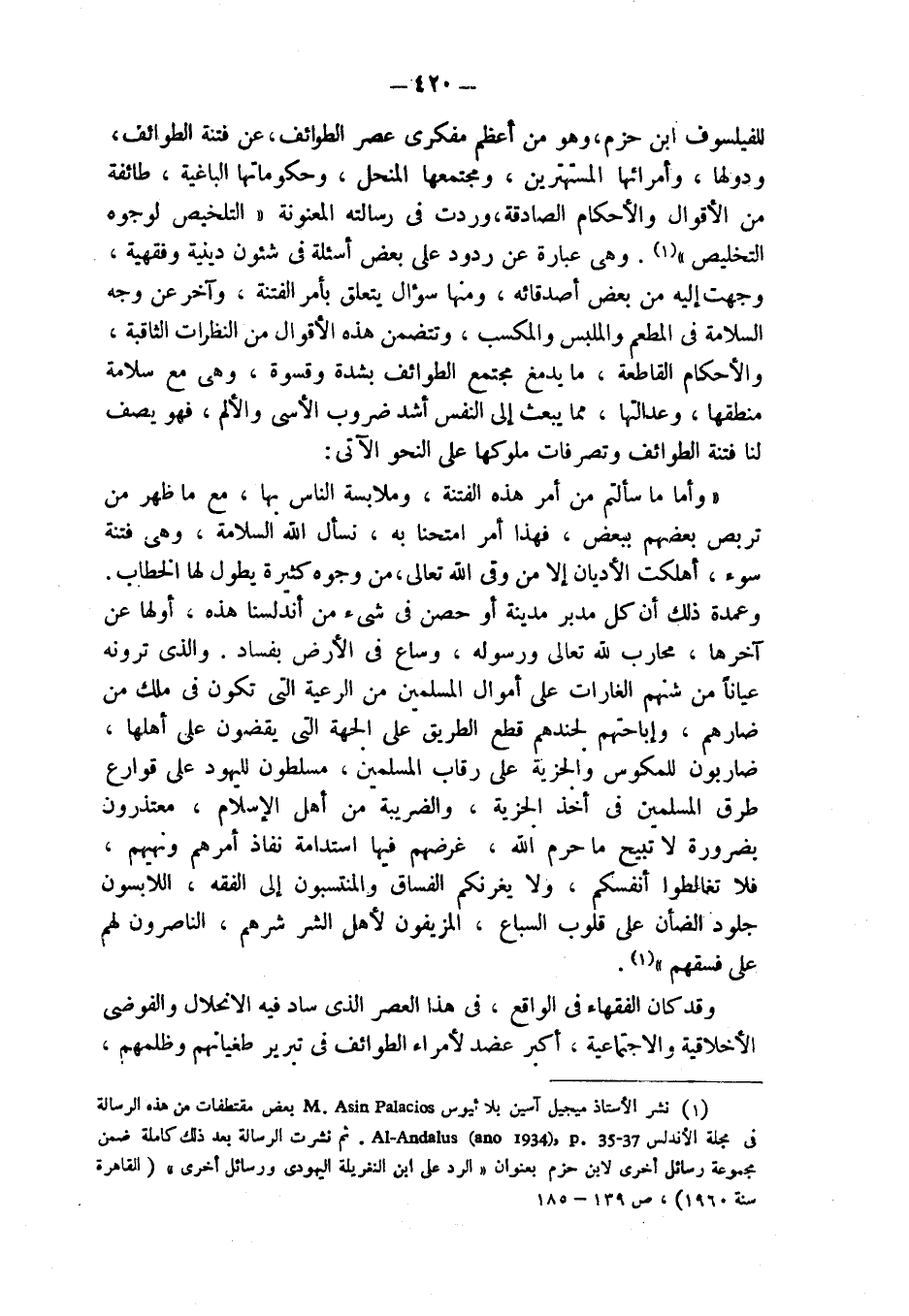للفيلسوف ابن حزم، وهو من أعظم مفكري عصر الطوائف، عن فتنة الطوائف، ودولها، وأمرائها المستهترين، ومجتمعها المنحل، وحكوماتها الباغية، طائفة من الأقوال والأحكام الصادقة، وردت في رسالته المعنونة " التلخيص لوجوه التخليص ". وهي عبارة عن ردود على بعض أسئلة في شئون دينية وفقهية، وجهت إليه من بعض أصدقائه، ومنها سؤال يتعلق بأمر الفتنة، وآخر عن وجه السلامة في المطعم والملبس والمكسب، وتتضمن هذه الأقوال من النظرات الثاقبة، والأحكام القاطعة، ما يدمغ مجتمع الطوائف بشدة وقسوة، وهي مع سلامة منطقها، وعدالتها، مما يبعث إلى النفس أشد ضروب الأسى والألم، فهو يصف لنا فتنة الطوائف وتصرفات ملوكها على النحو الآتي: